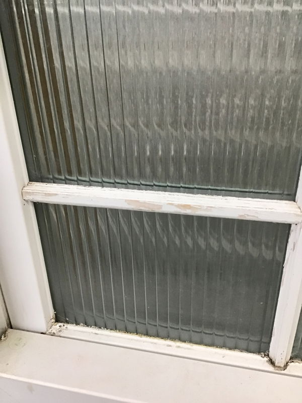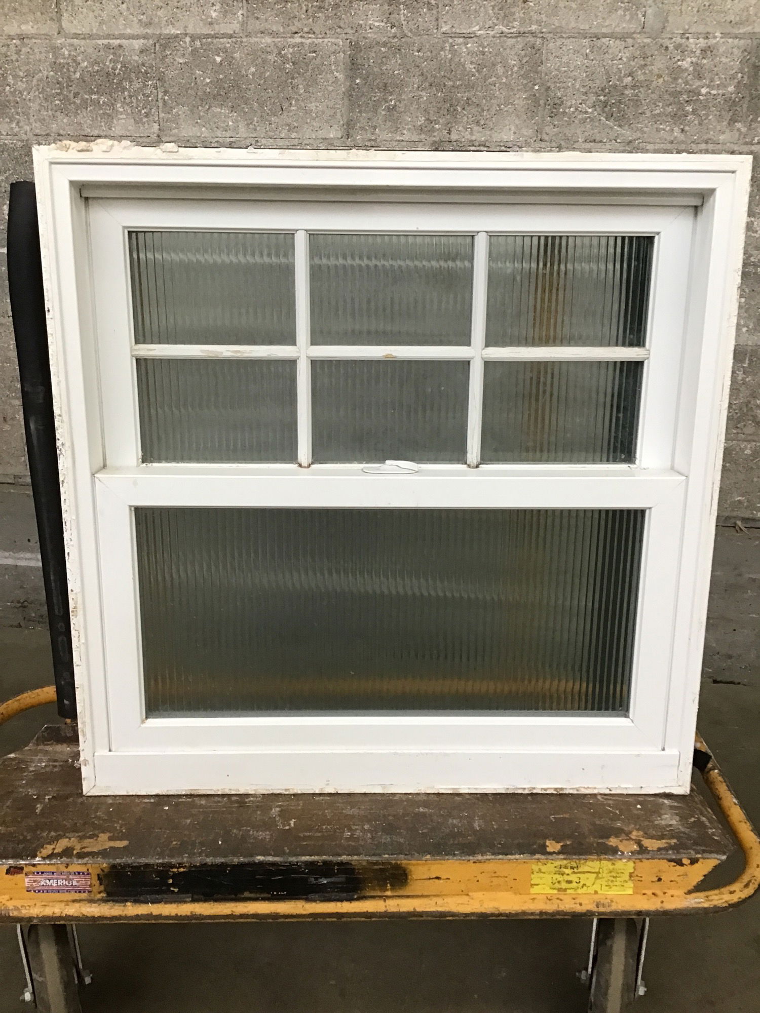 Used but still usable fiberglass single hung window with obscured reed glass. Would make a darn good bathroom window.