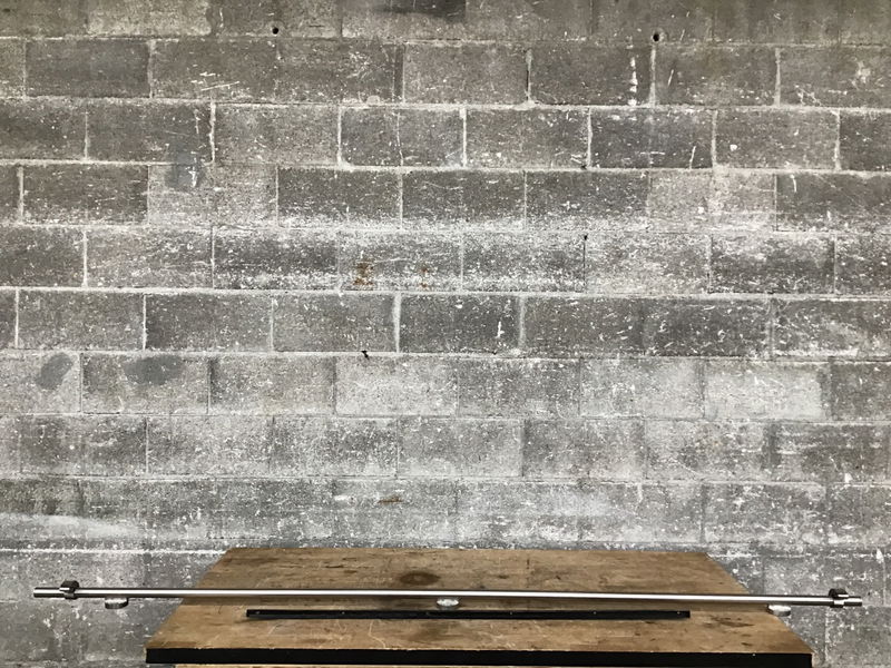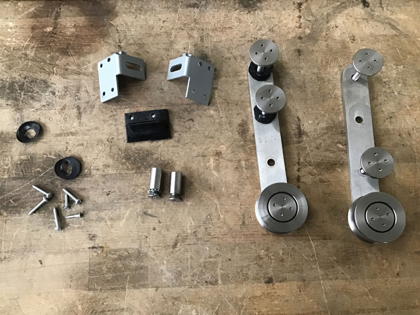 Stainless steel barn door track with wheels, mounting pegs, bottom guide and accompanying hardware. Essentially everything you need to hang an interior barn style door. In good condition with wheels that operate smoothly. Photo may be representational.