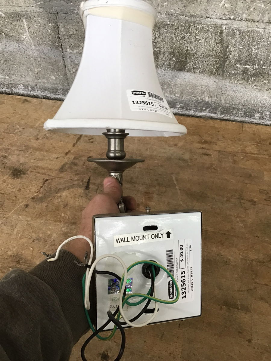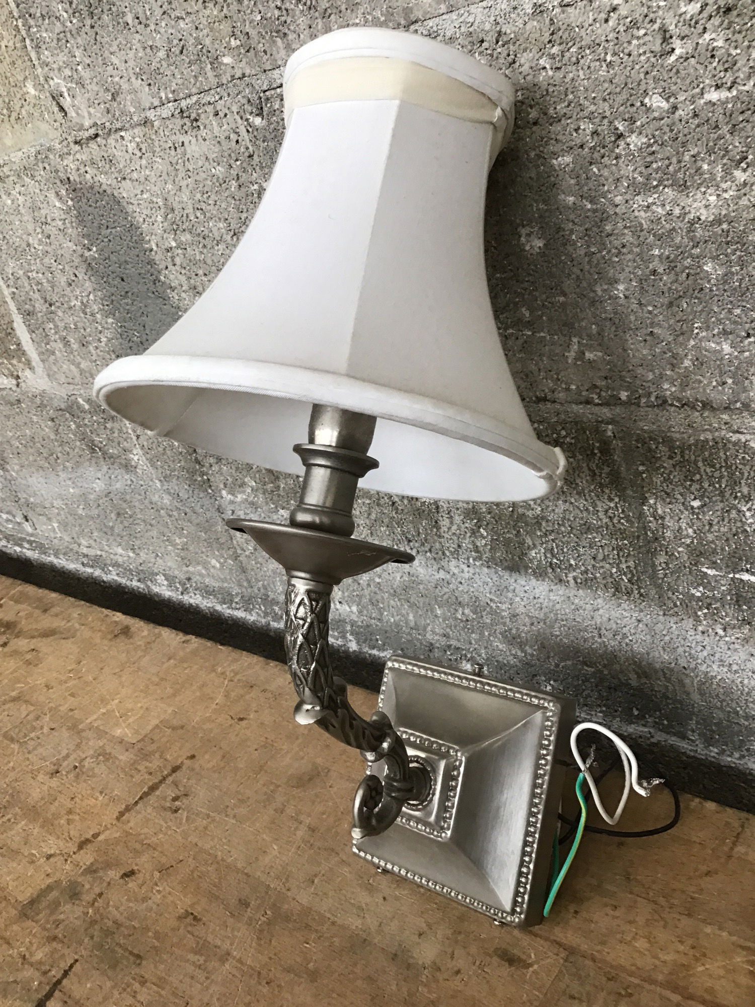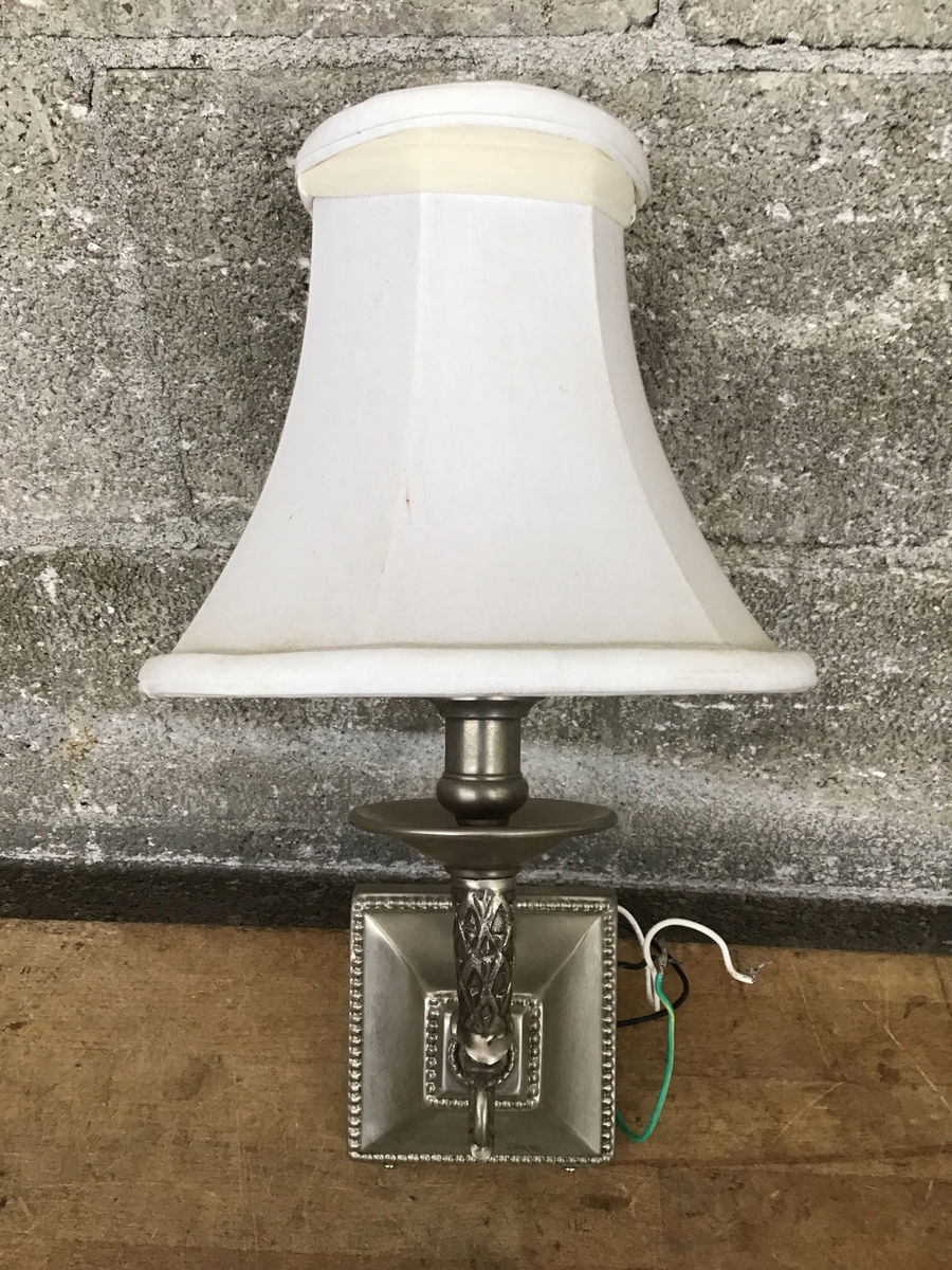 This indoor wall sconce features a brushed nickel finish with ornate embellishment details on the frame. Made in 2001 and is suitable for dry locations only. Has a fabric opaque shade.
