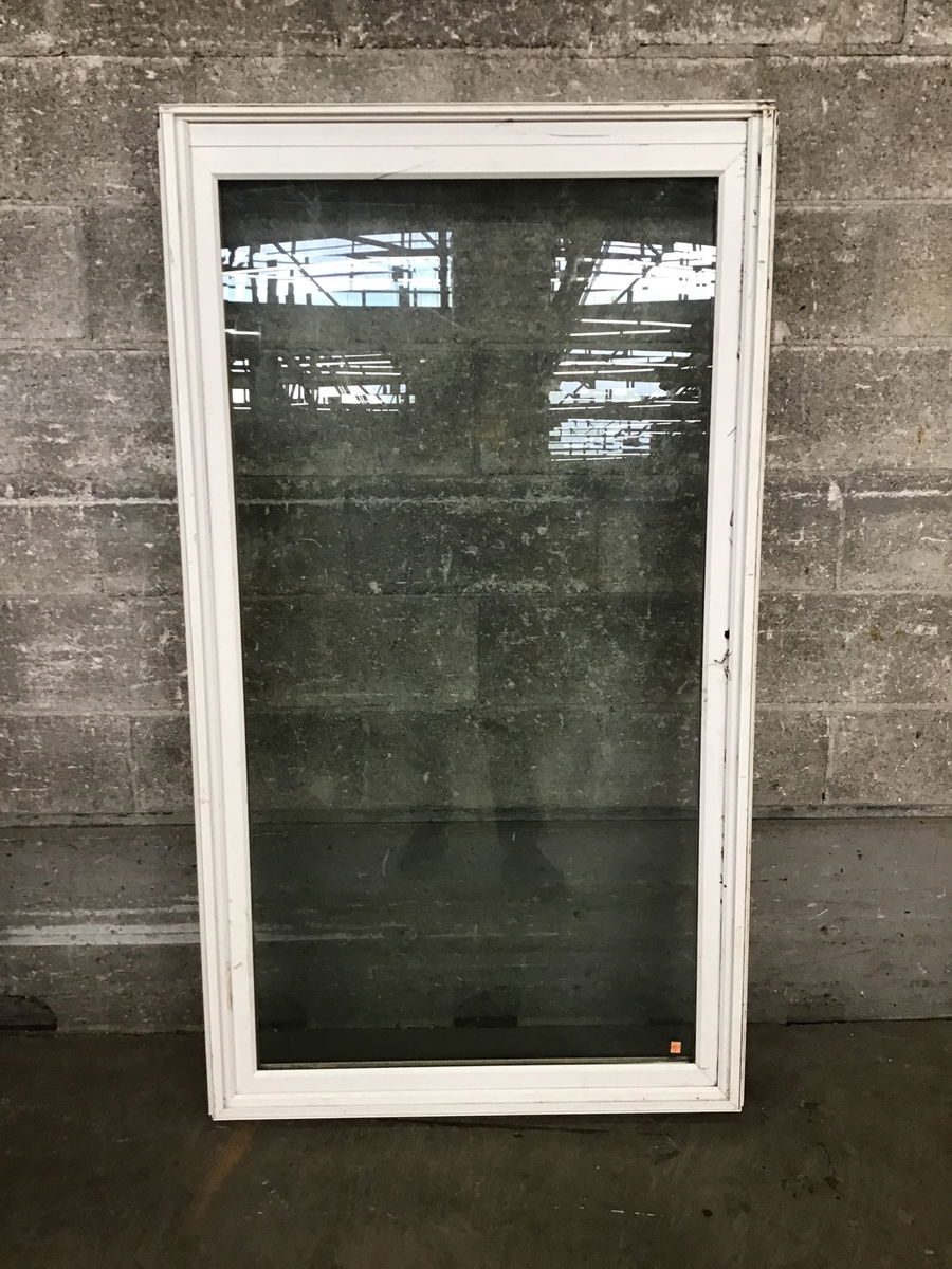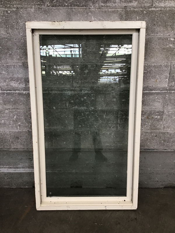Older but still usable fiberglass fixed window with tempered, thermopane glass.