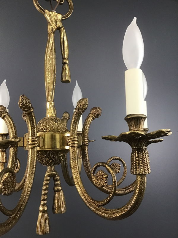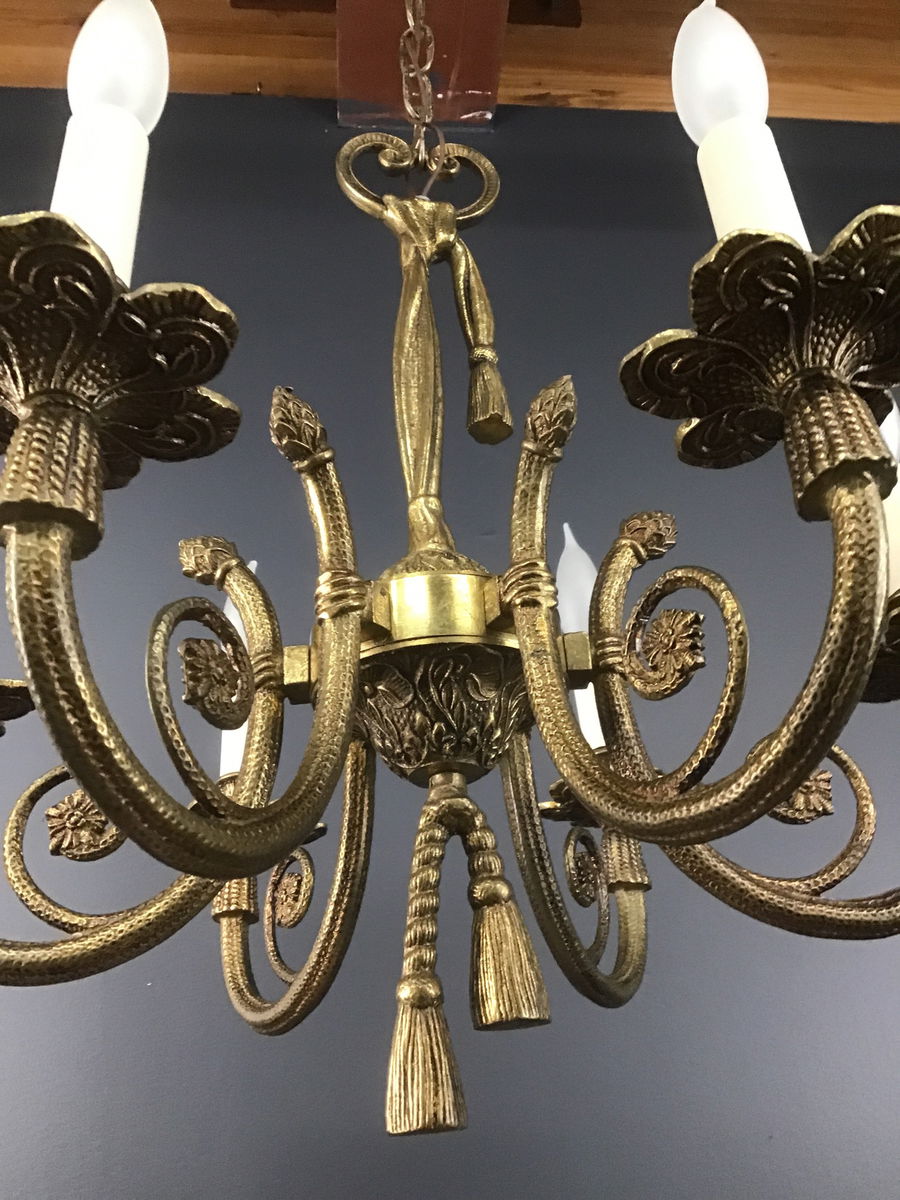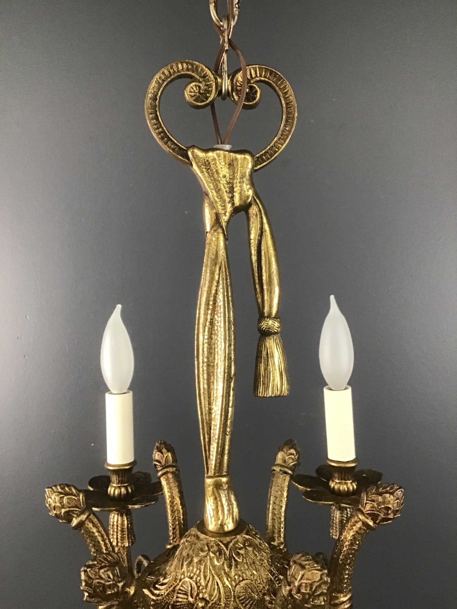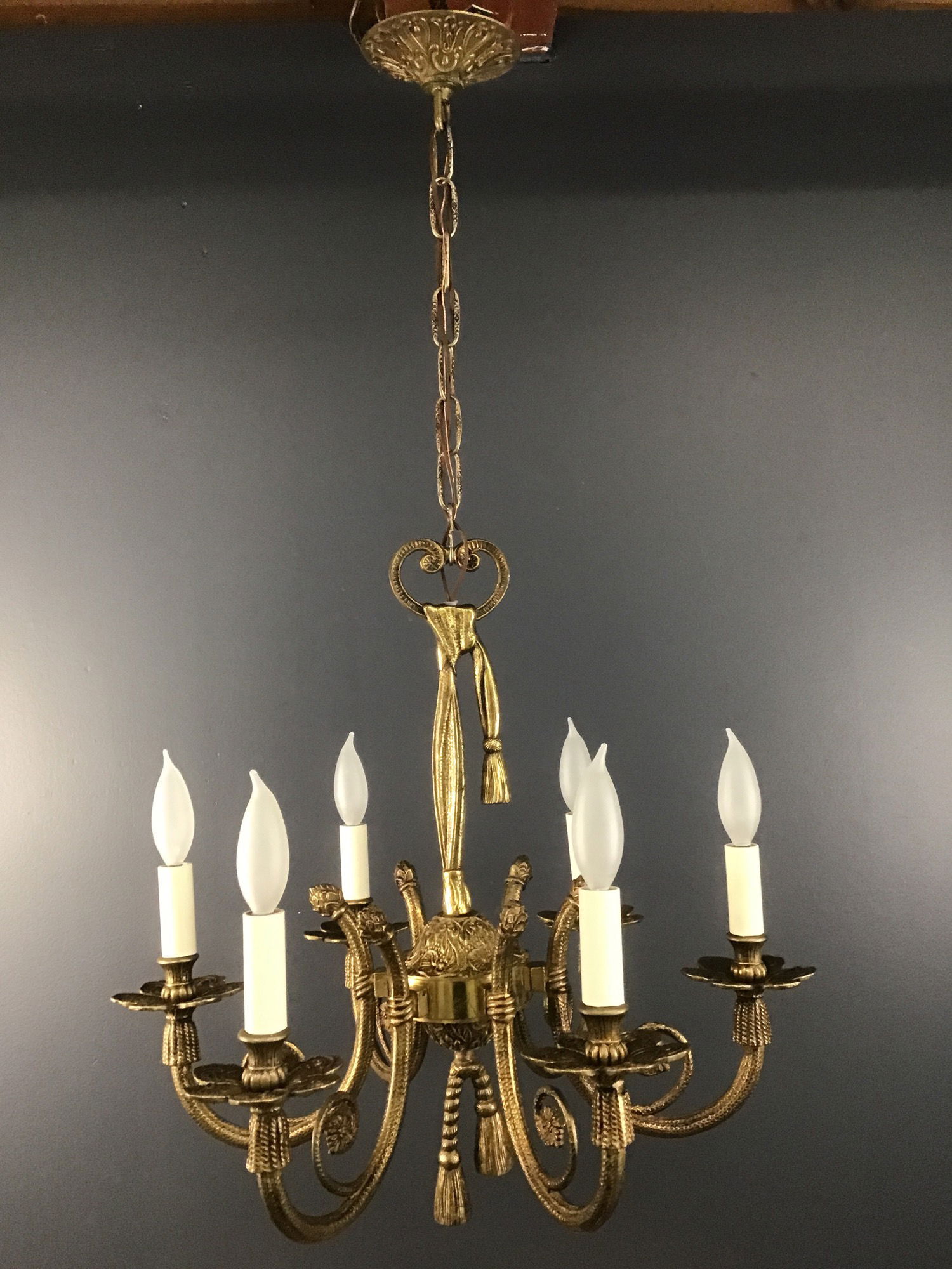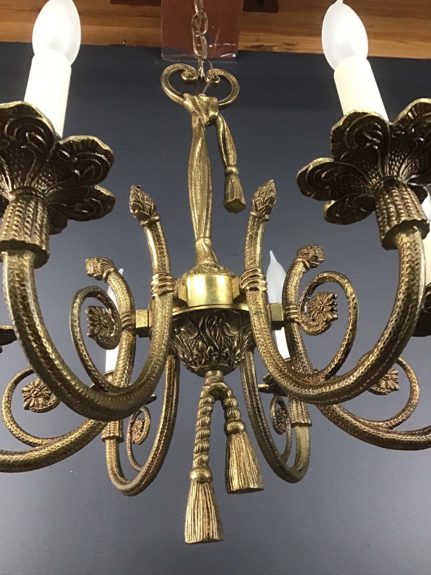 A gorgeous and unusual 6 arm brass chandelier. Made in Spain featuring flowers, pinecones, and tassels. The center piece looks like a draped and knotted piece of fabric with a tassel on the end. I have never seen one like this, and I have see a LOT of Spanish chandeliers!