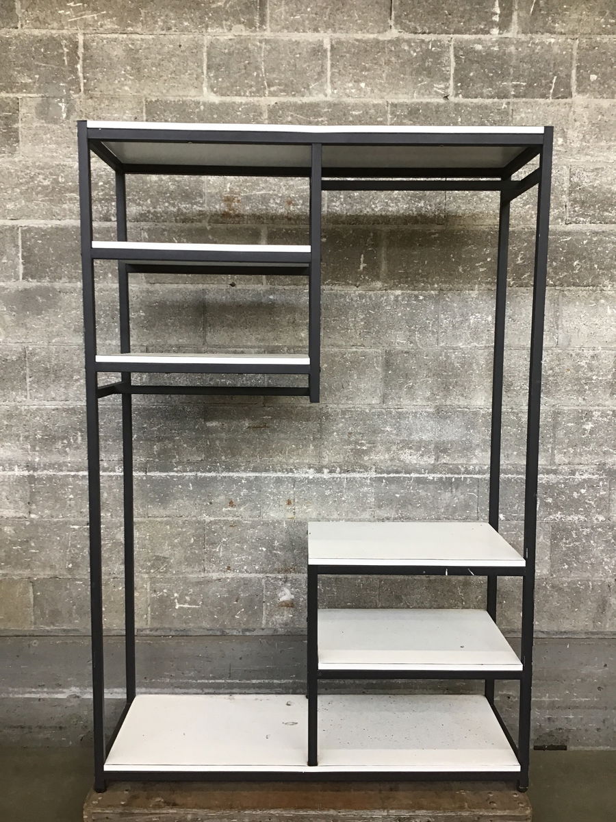 A modern-styled bookshelf/organizer, with five little shelves with varying heights for display and a little hanging rod of sorts, constructed out of powdercoated tube steel. It seems to have taken a bit of wear from weathering.