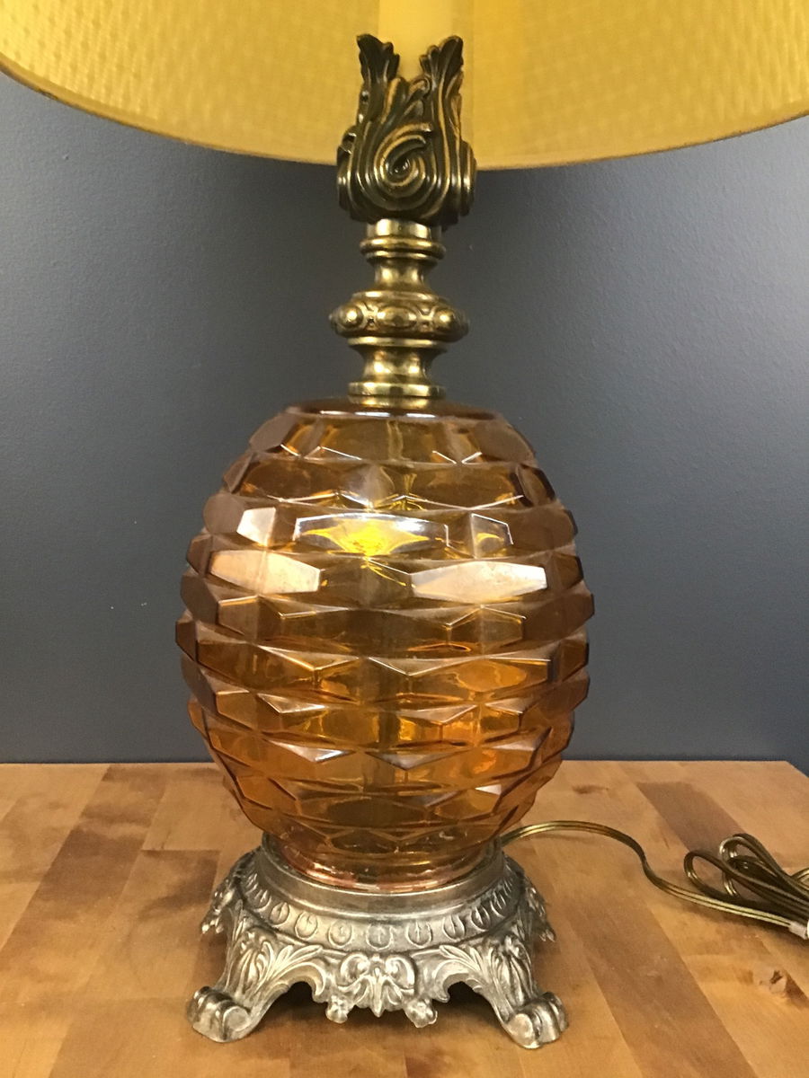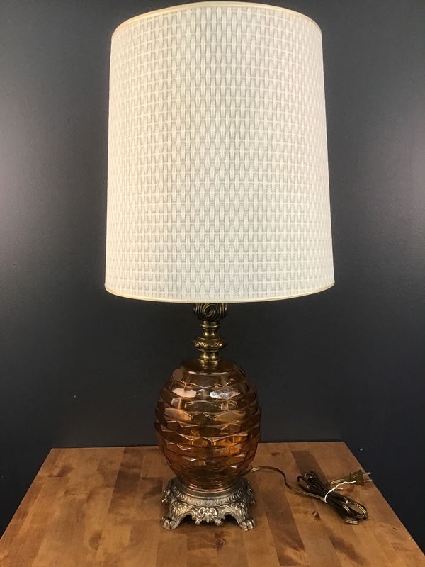 A lovely vintage Hollywood regency table lamp made by Honi Chilo in the 1960s. Base is composed of decorative brass and an amber glass globe and features a 15" x 15" shade with a basket weave pattern. Restored in our on site light repair workshop