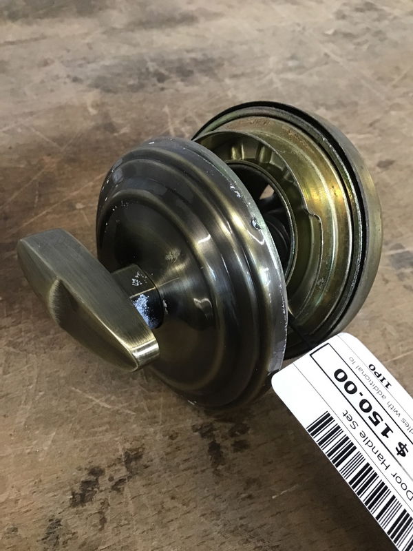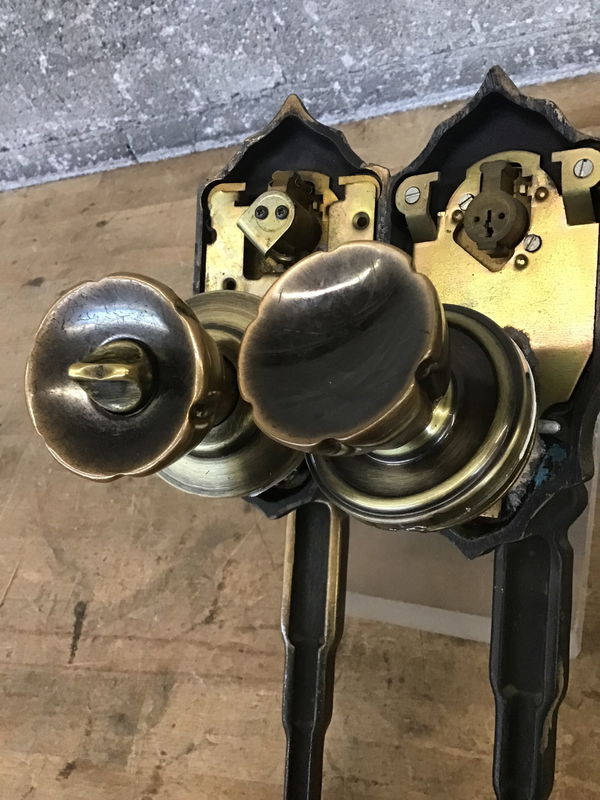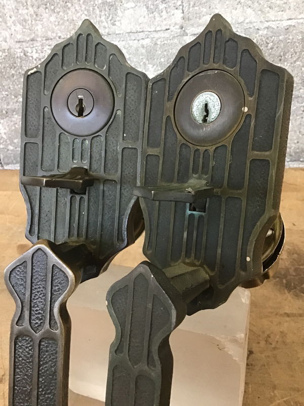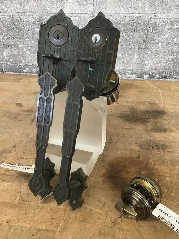 A commanding pair of vintage door handles with additional lock included. These door handles feature a patterning of cylindrical rectangles that mimic a iron gate. A very regal and austere set of door handles fit for a classy manner.