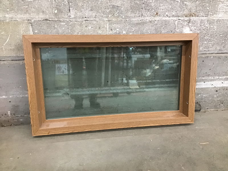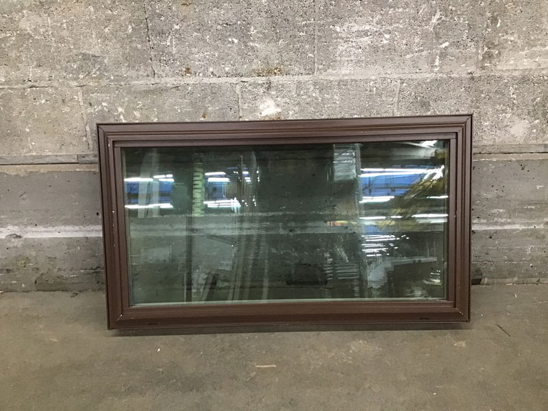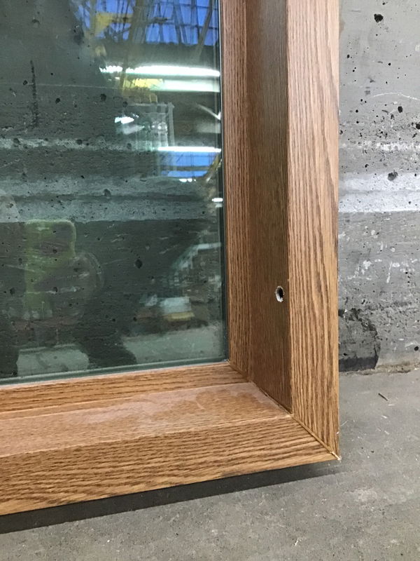 Unique fixed vinyl window in great condition. The exterior is brown and the interior is... faux oak laminate. Yep, a first for me also. It's so well done though! Reminds me of a 1980's end table, but a window. I can't find an age stamp but I'd be surprised if it's older than 20 years.
