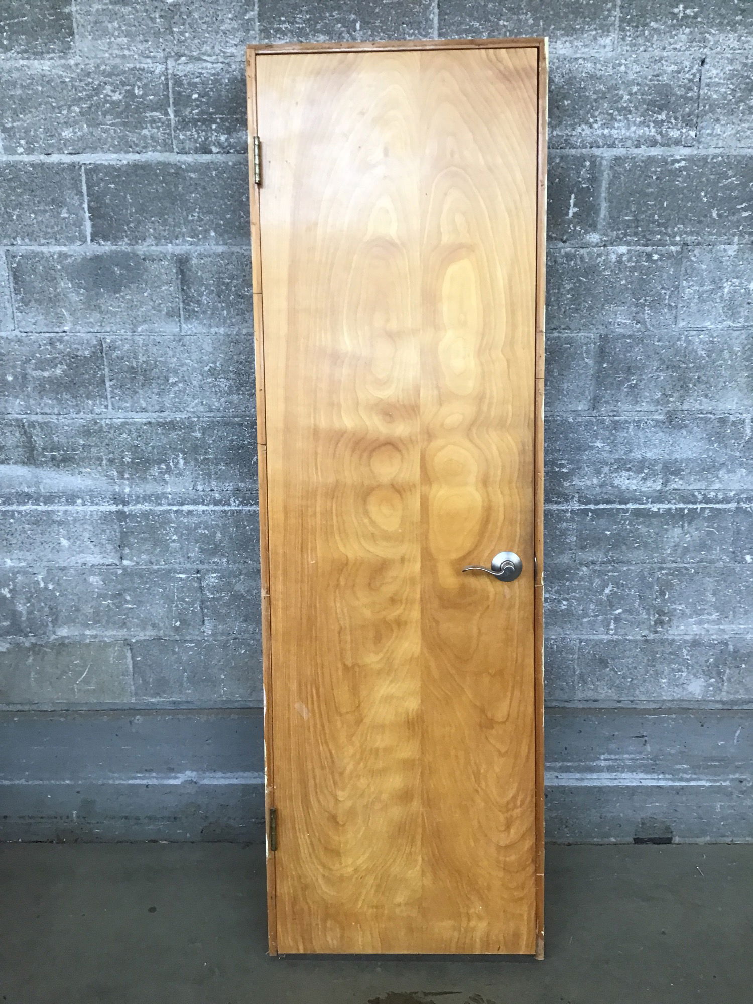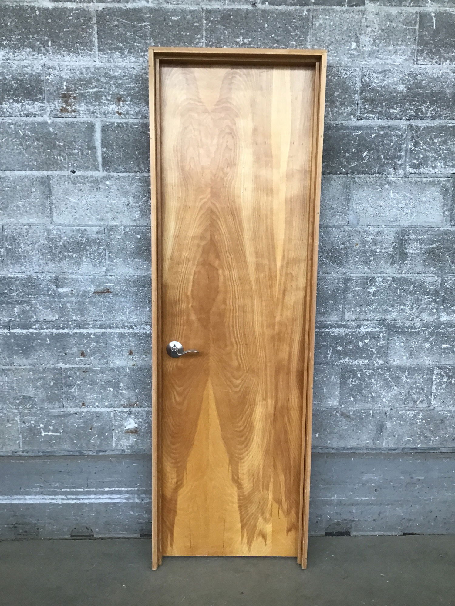 24" Birch Hollow Core Door with a well taken care of veneer finish. Classic midcentury door. Has modern knobset and fir jamb. Has some kids measurement marks on the inside of the jamb. Cute, but you'll have to sand that off if you don't want the marks.