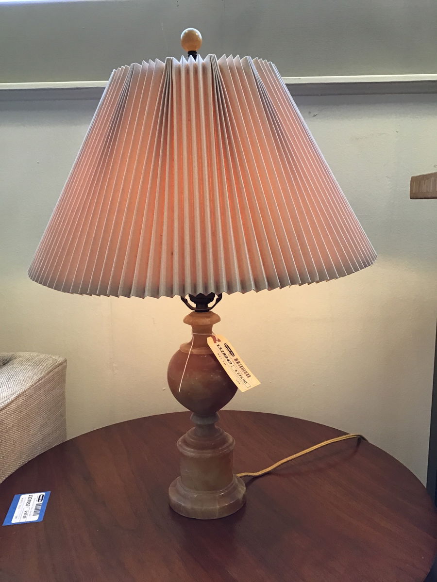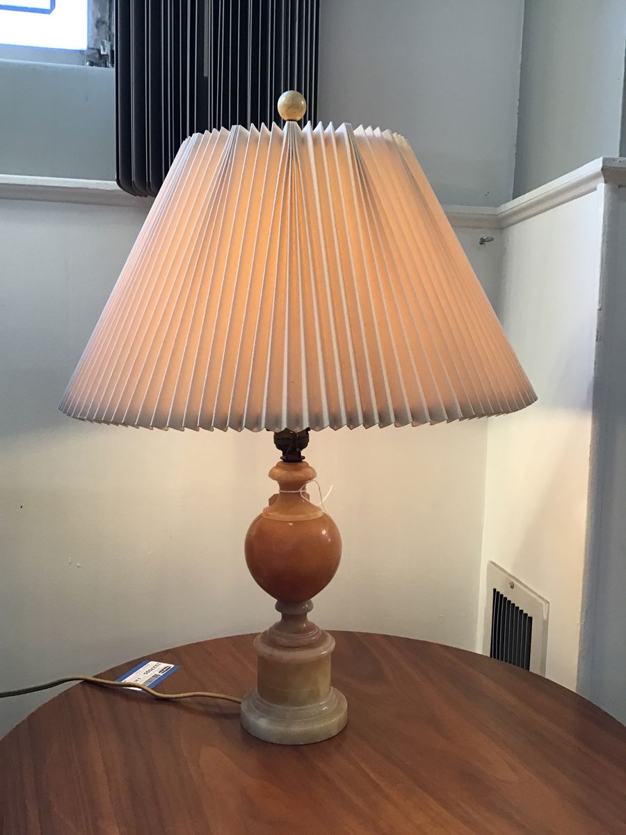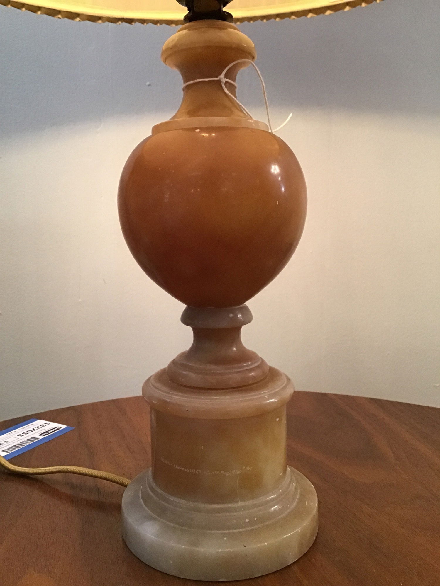 Gorgeous pair of shimmery light yellow/pink table lamps. Not quite sure on the material but our best guess is yellow onyx. Missing one finial and both need shades but these are real beauties with gorgeous coloring and lit up when tested in house.