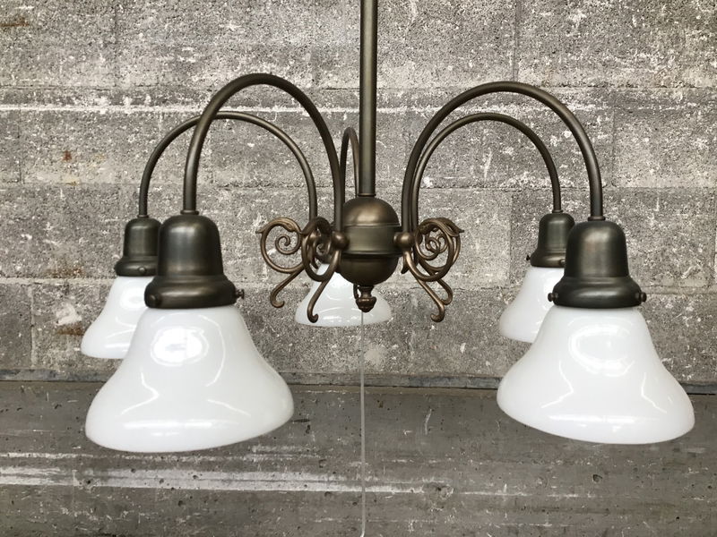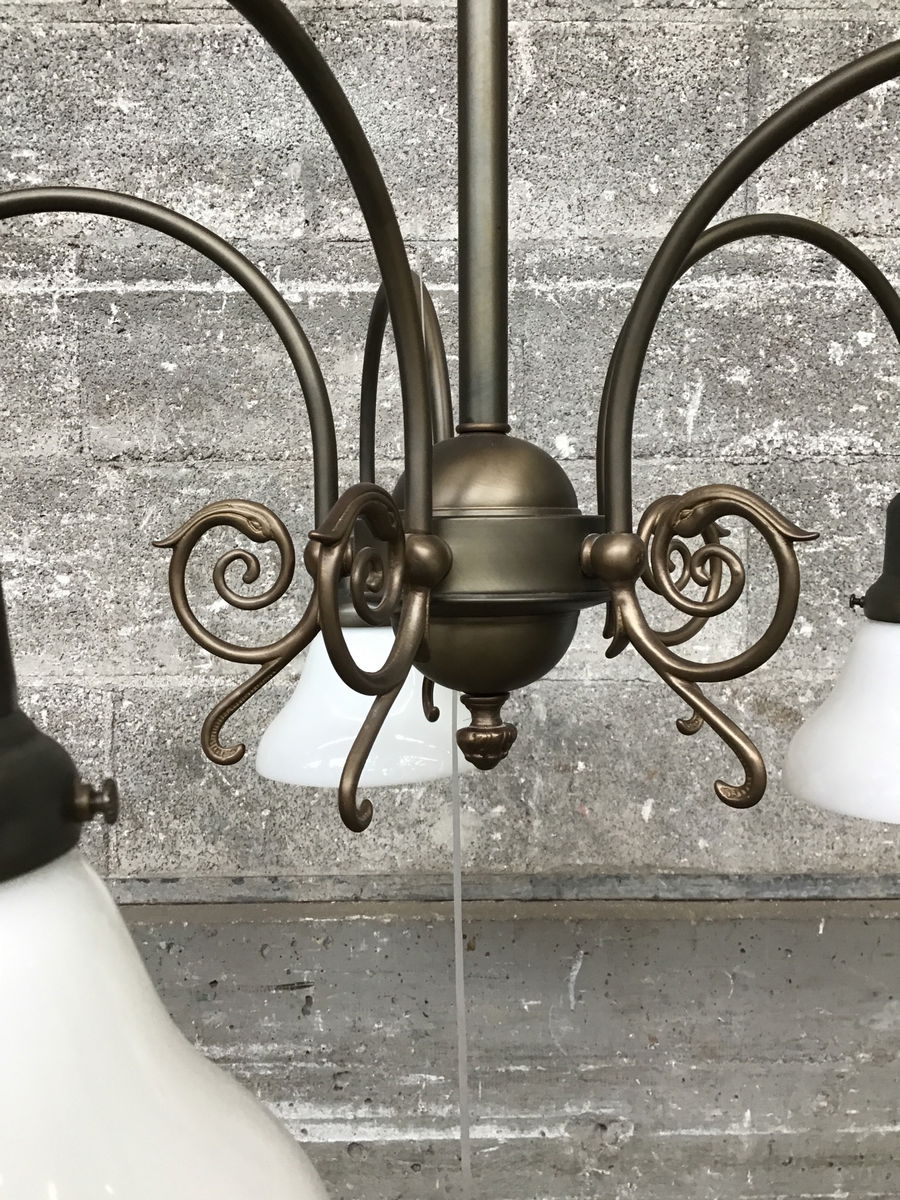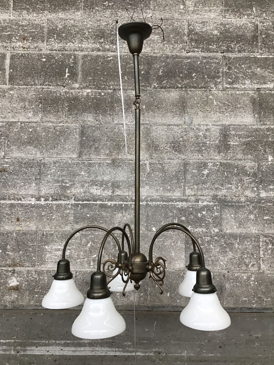 Reproduction (a la 1999) brass and glass chandelier with five arms, ornate details and opaque glass shades, brought to you by the Antique Lighting Company out of Seattle, Wa. Appears to be in great shape and is ready to go.