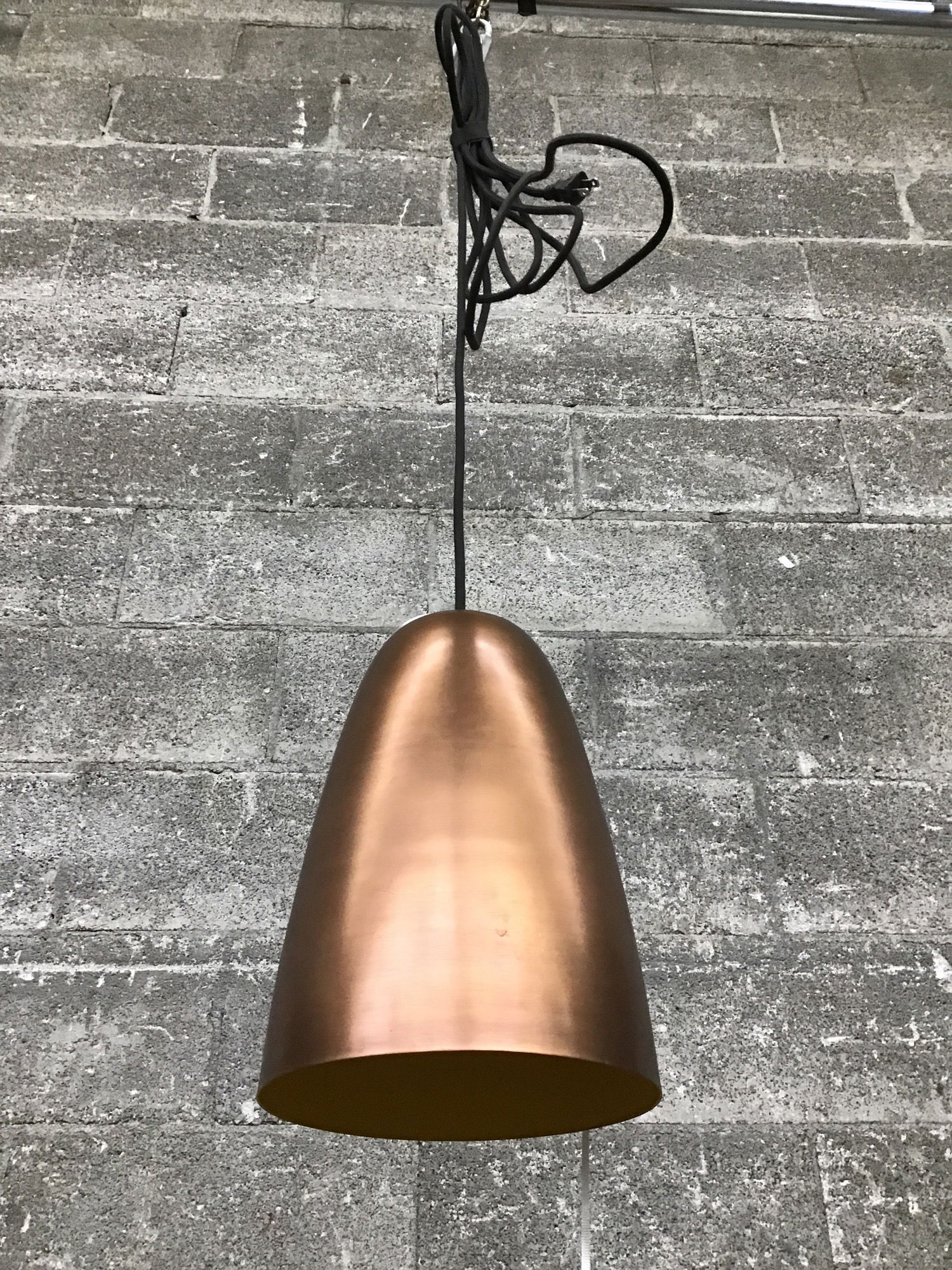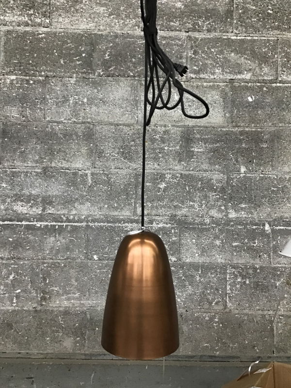 Sweet bell shaped pendant light featuring a brushed copper shade that is a brilliant shade of yellow on the interior. What a twist!! This is suspended from a long cord that simply plugs in, making it a great option for someone who is renting or doesn't want to delve into hardwiring lights just yet. Dimensions listed are just for the shade. Photo may be representational. Cord color may vary.