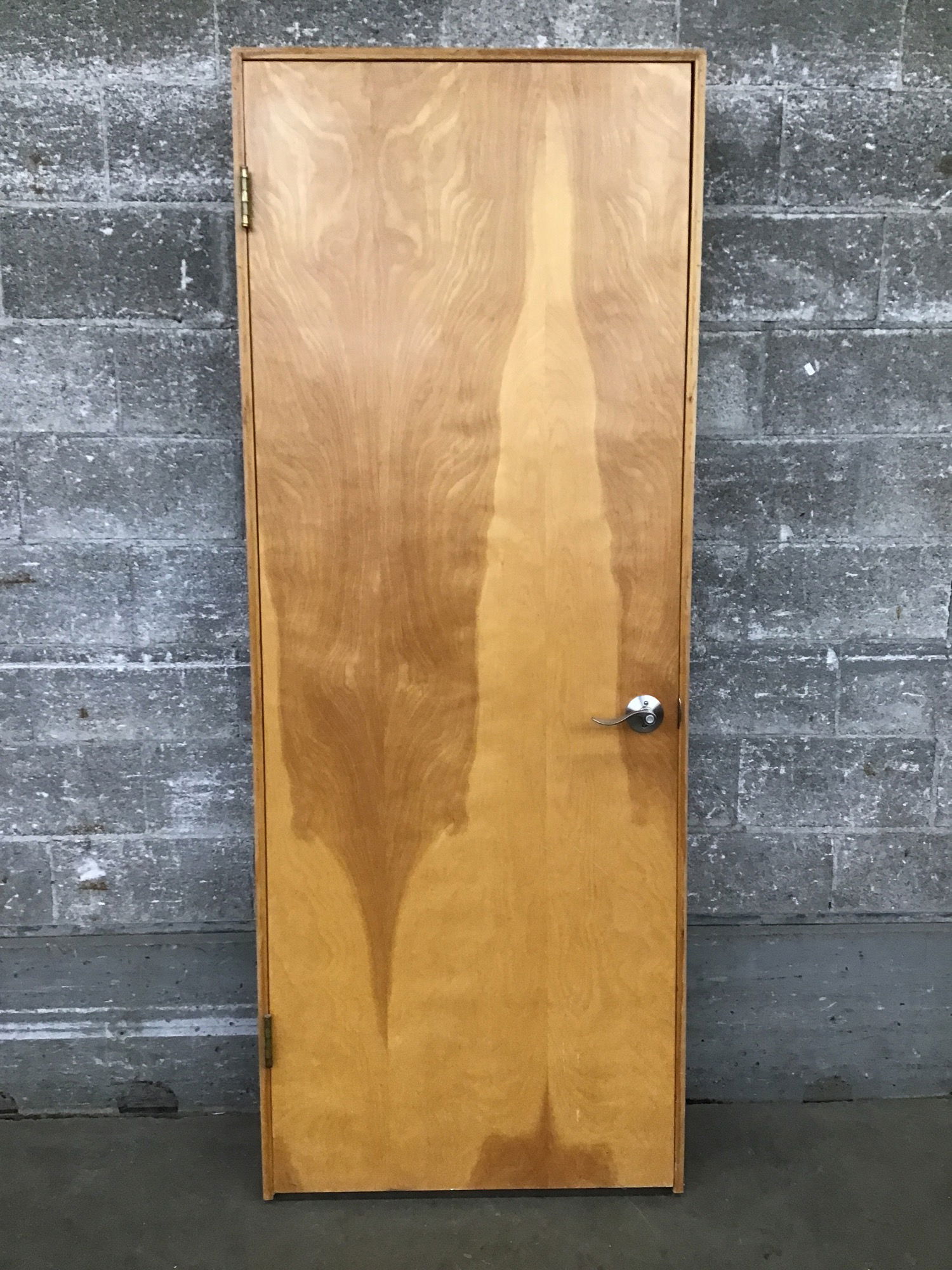 Midcentury looking, clear finished (or a very light stain) birch veneer, hollow core interior door in adjustable thickness jamb that is currently at ~ 4 1/2". Comes with a nickel finish handle set.