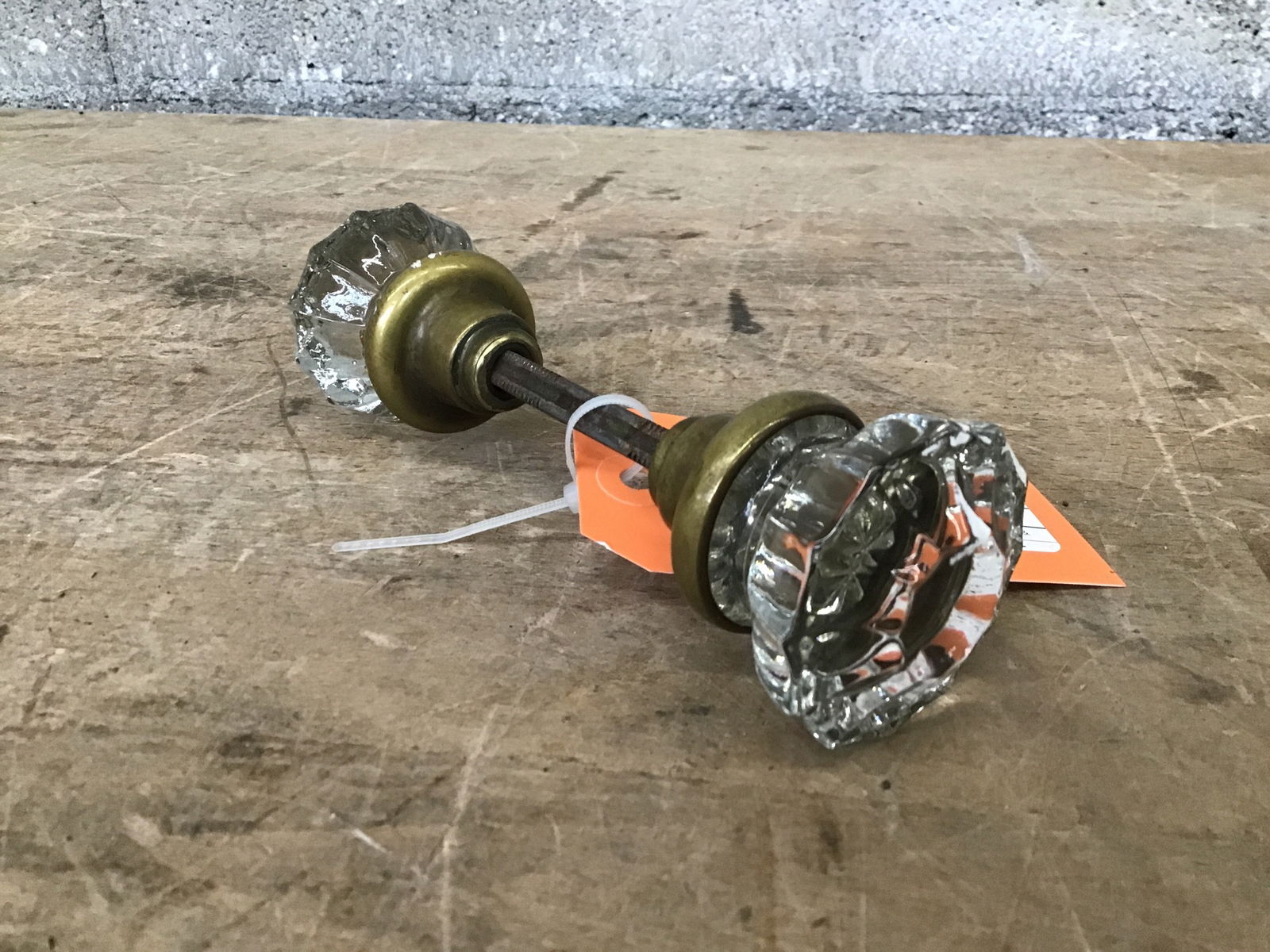 Pair of vintage glass knobs with brass collars. Set screws & spindle all present and accounted for.