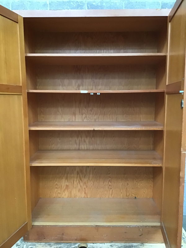 Gorgeous CVG fir cabinet that features four shelves and oodles of storage space. Likely came from a school originally and showing some minor cosmetic wear from those years of use.