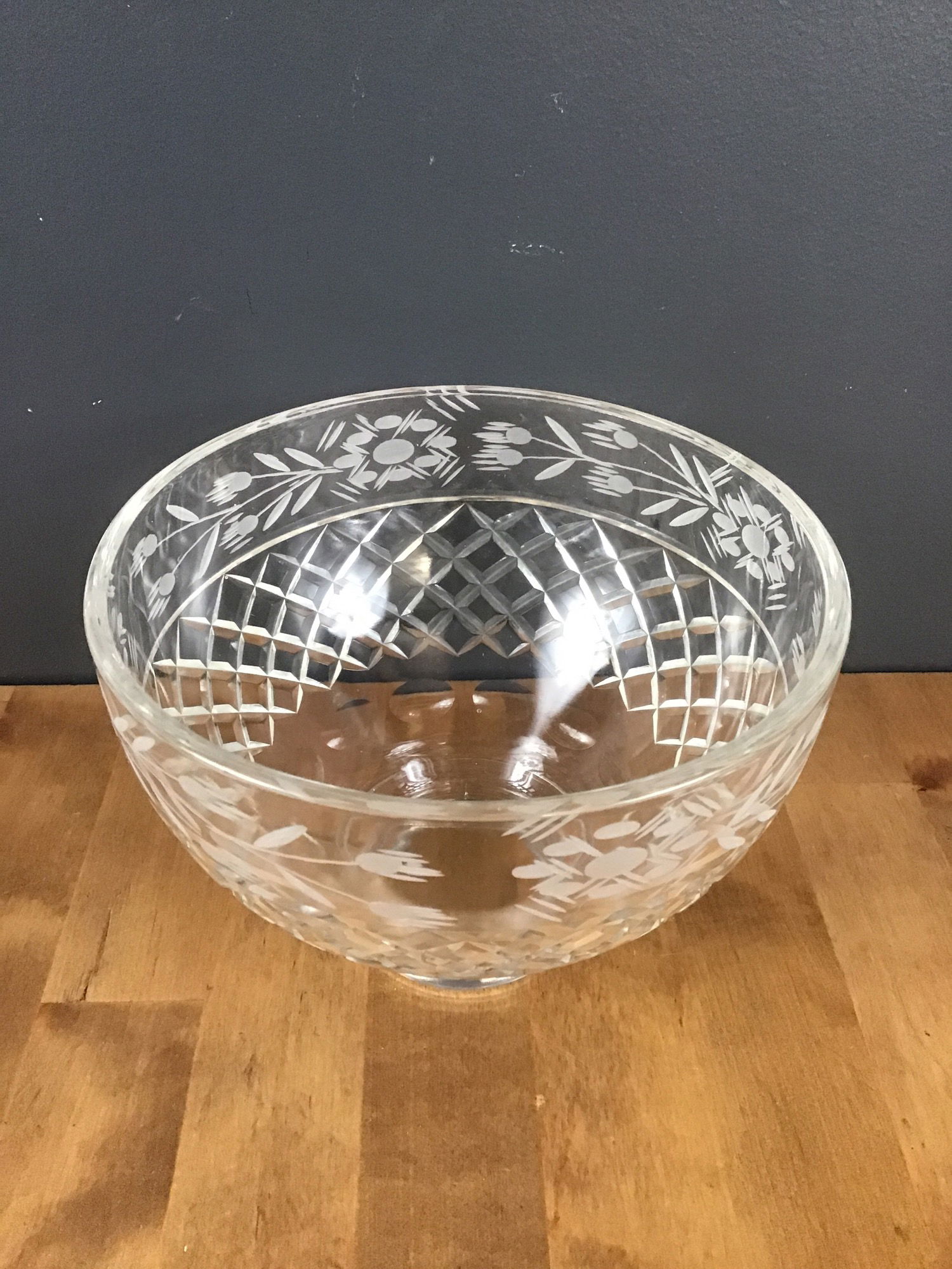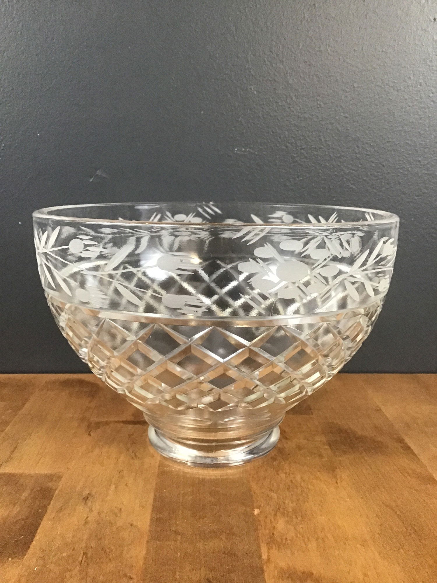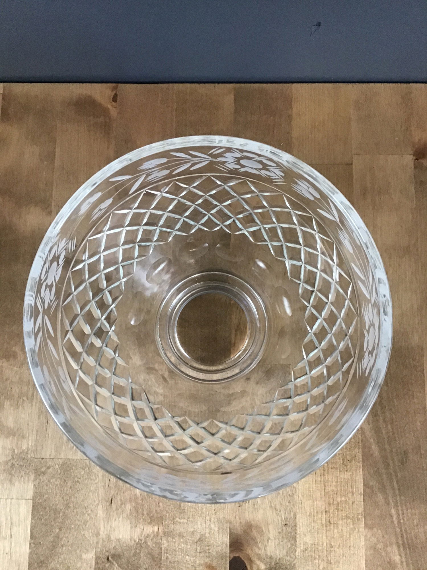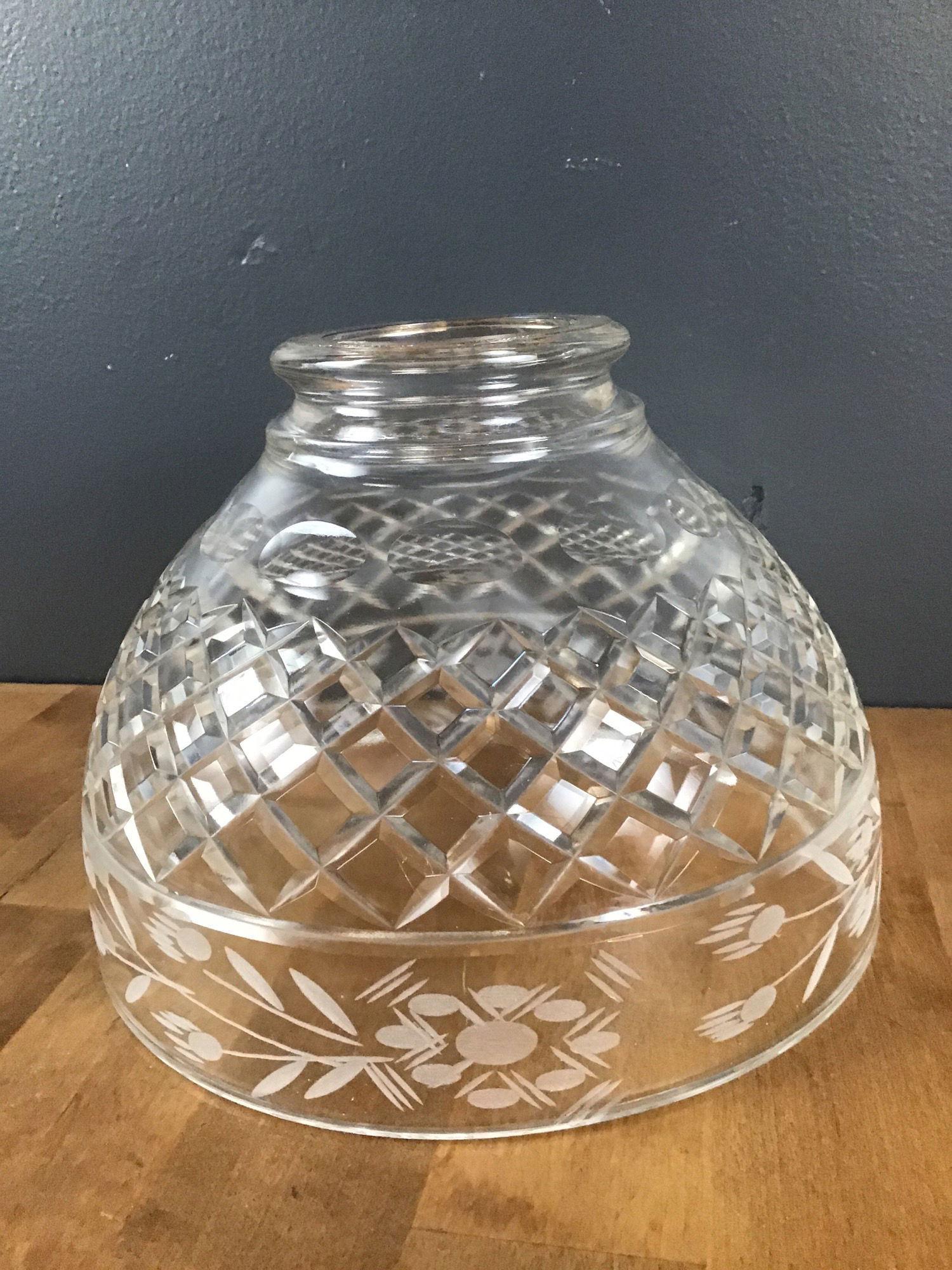 Diamond cut leaded glass light fixture shade. Beautiful etched patterns along the border with floral patterns. Diamond pattern on the dome itself. 2" fitter opening.