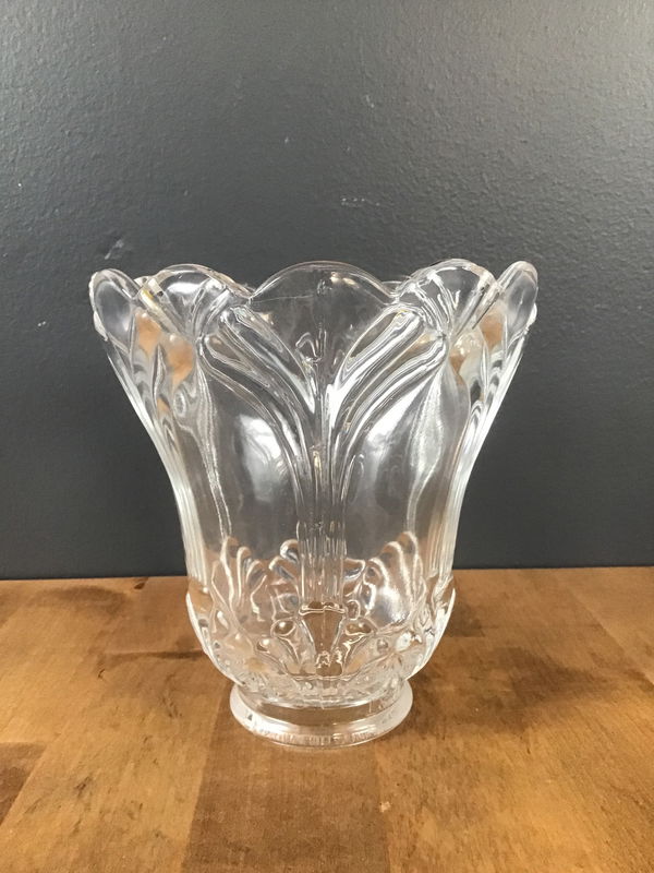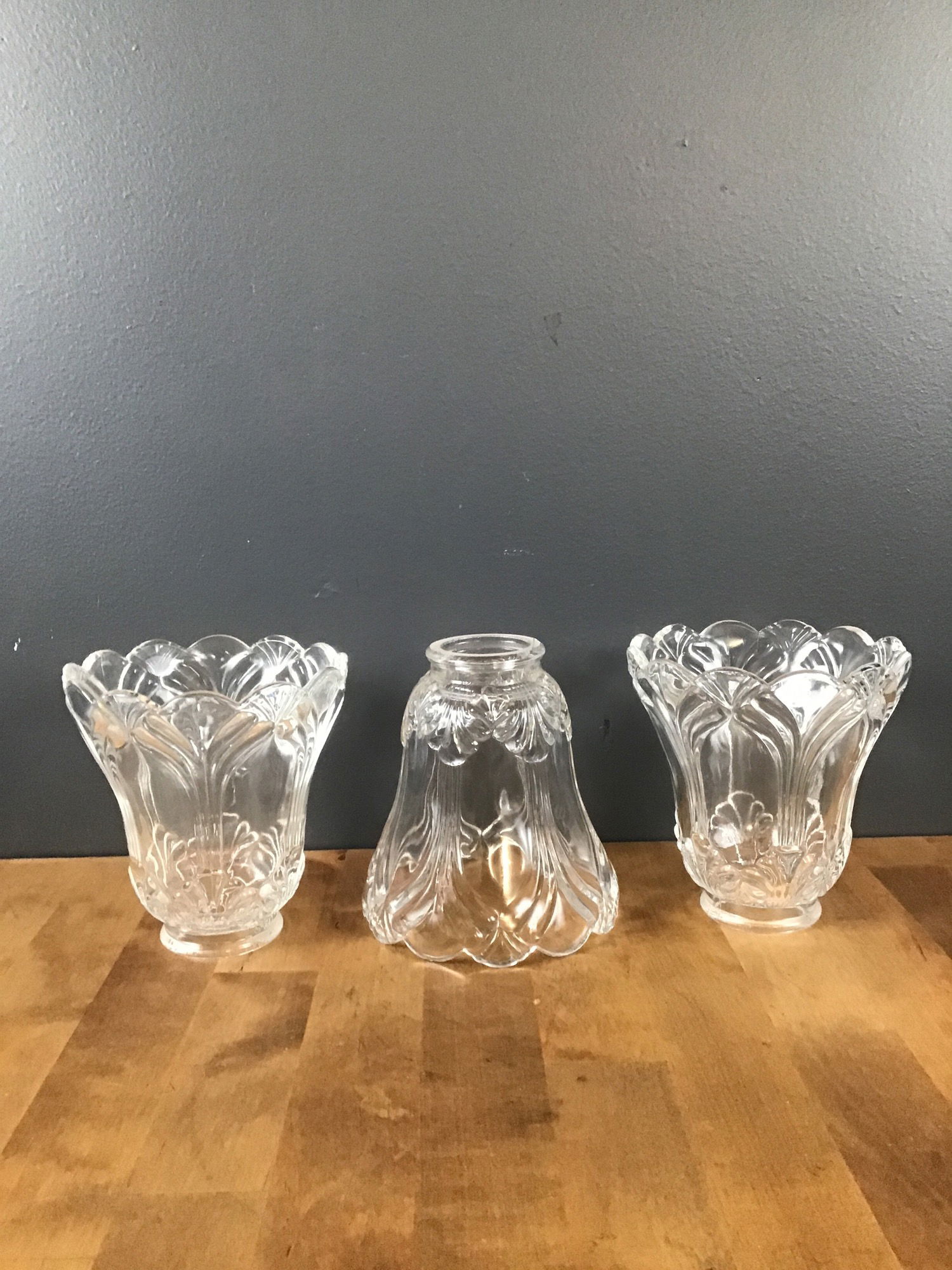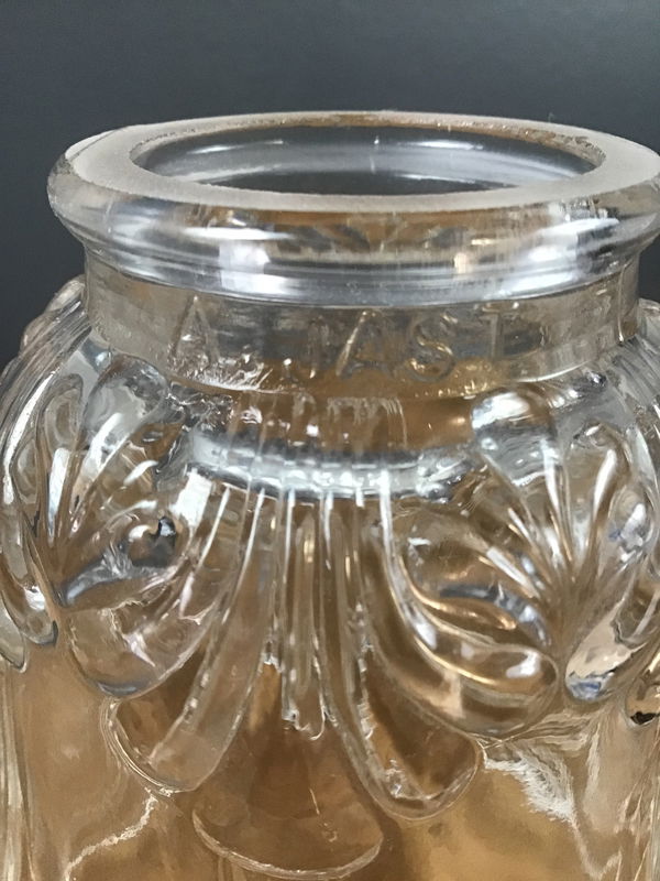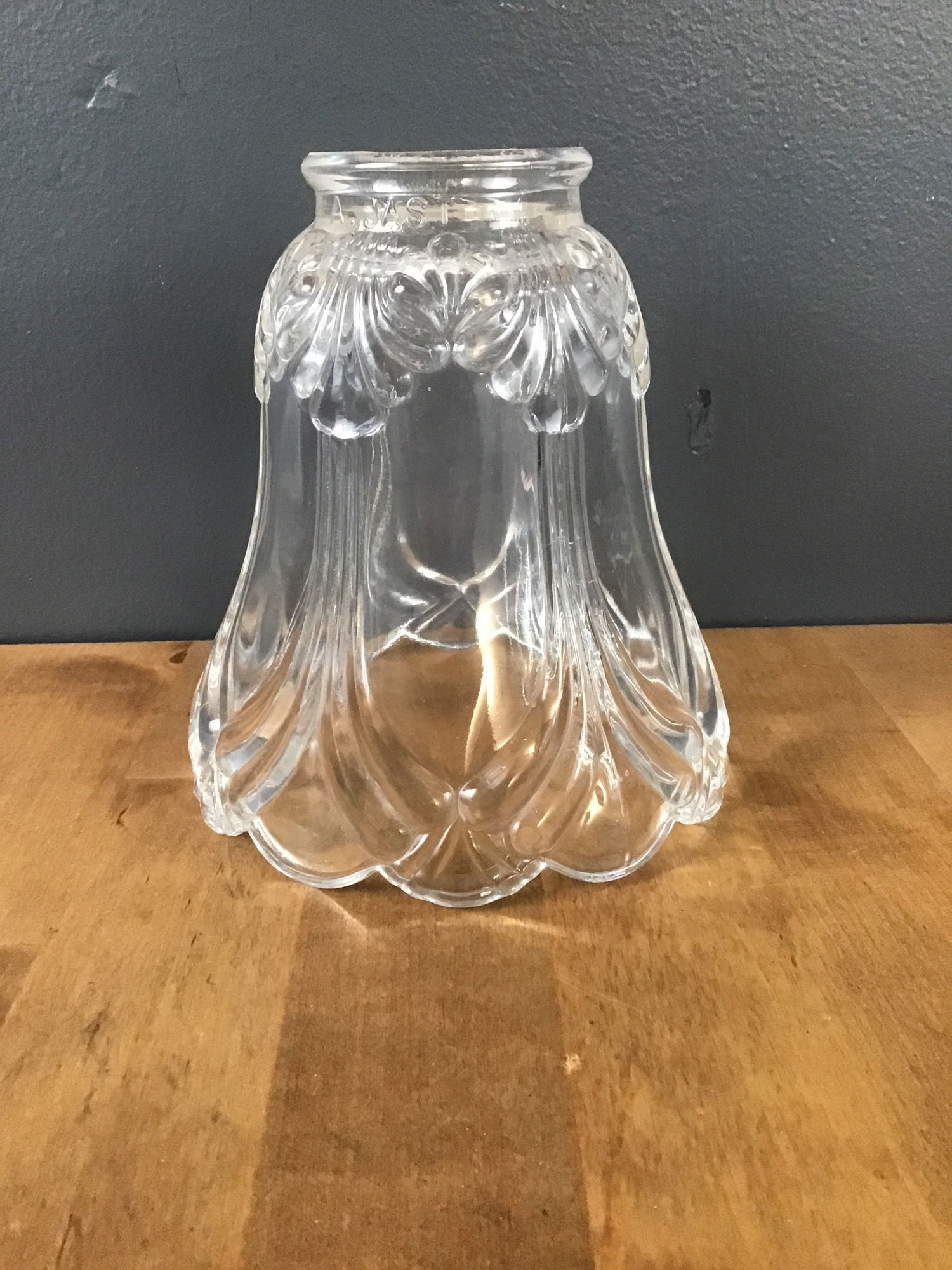 Set of 3 bell shaped Art Nouveau style glass light fixture shades. Clear glass with scalloped edges on the border. 2" fitter opening on each. Has name "A. Jast" along the rim, but could not find any info.