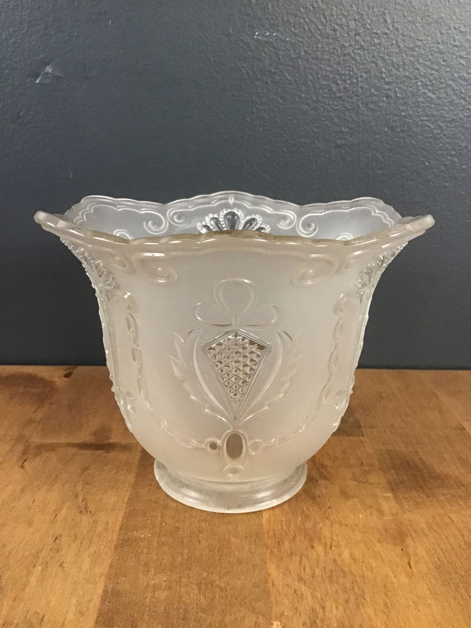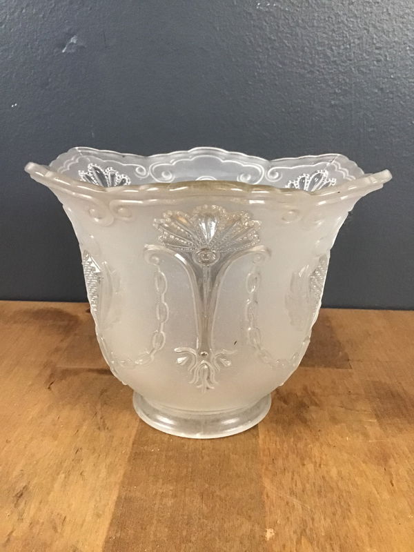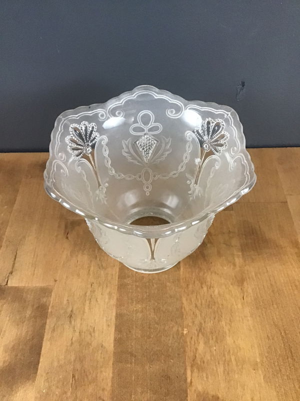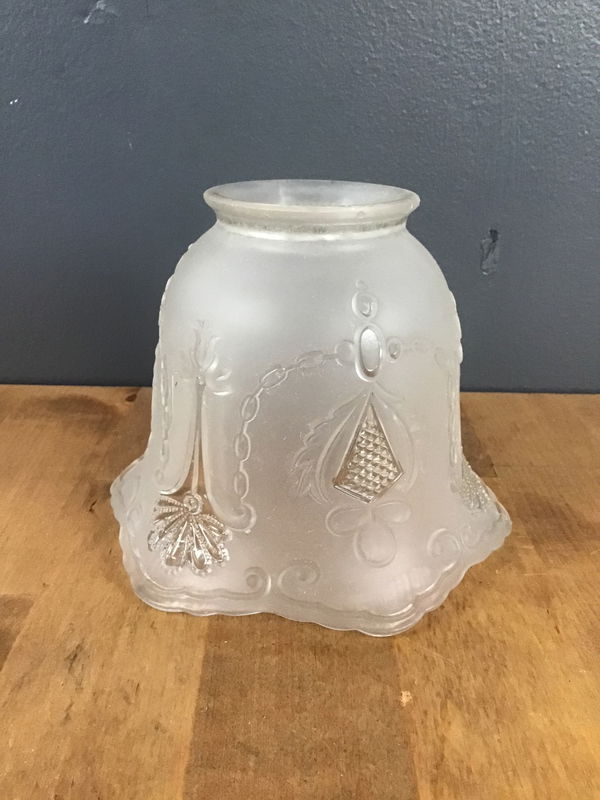 Antique pressed manganese glass shade for a gas light. Fits 2 1/4" holder Cute and coquette mini glass fixture shade. Frosted glass with sweet chandelier designs all along the base. Pockets of clear glass really sparkle when the light hits it just right. 2" fitter opening