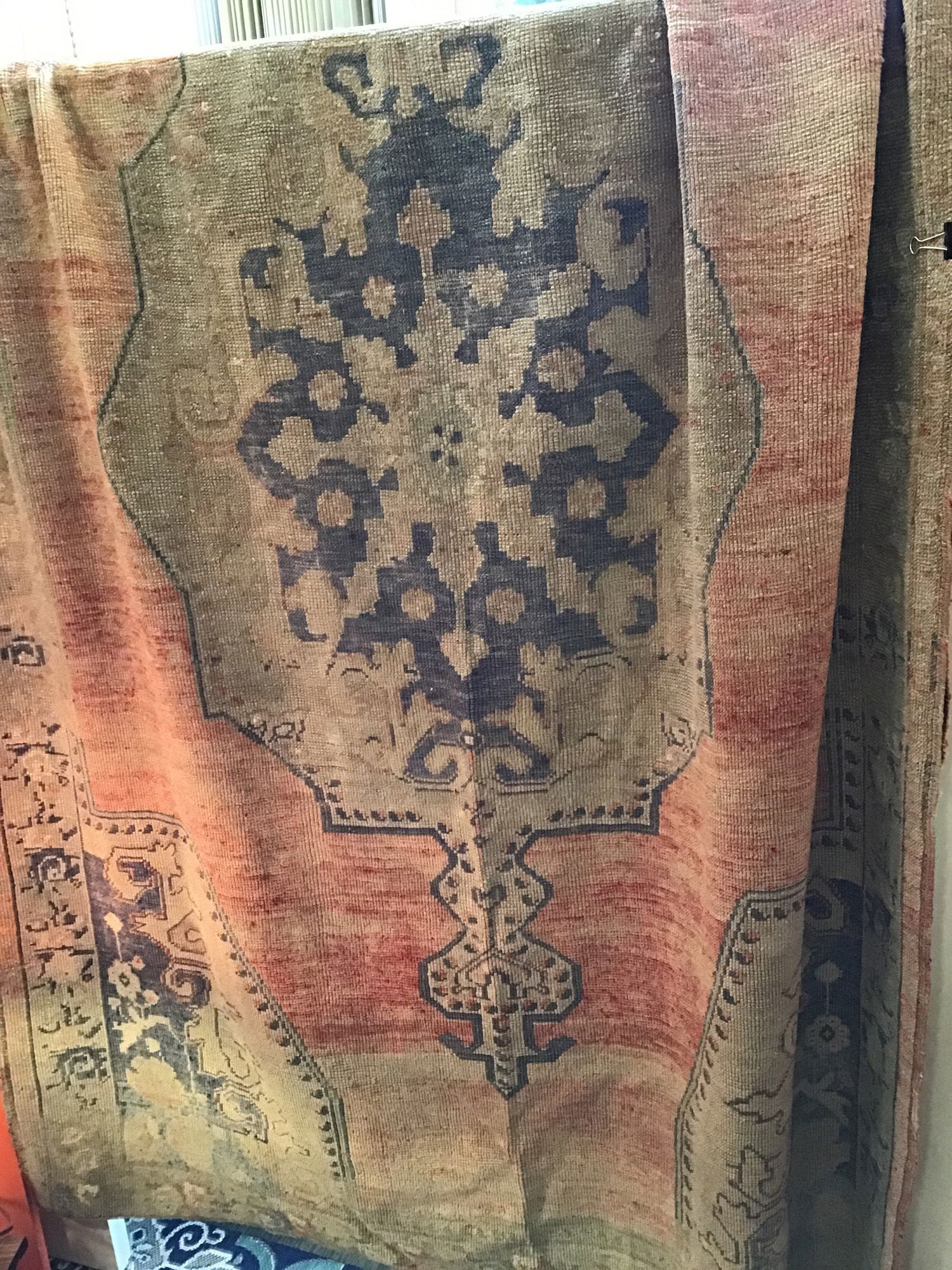This is what seems to be a hand woven, vintage Turkish Oushak rug. Either 100% wool or a mixture of wool and silk, this is most likely a distressed Oushak rug with faded designs in a cream color with blue designs. Nicely sized as well and seems to have held up well with time.