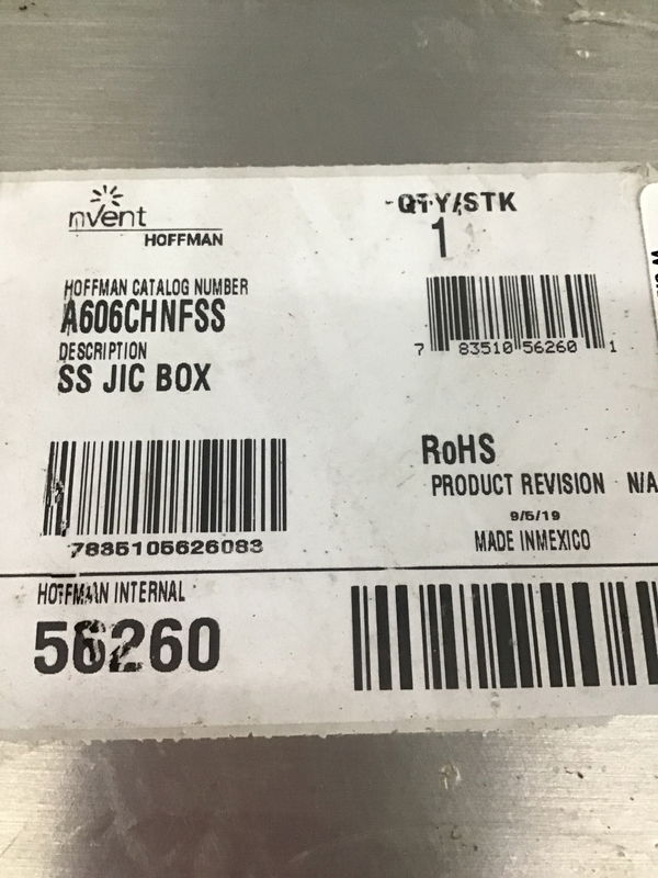 A Hoffman model A606CHNFSS enclosure: 304 stainless steel, with a hinged door and NEMA 12/3R/4/4X. It's still in the riginal packaging, even. Retails new for about $475.