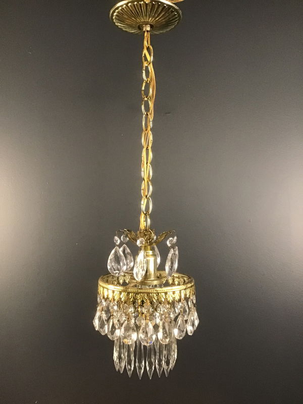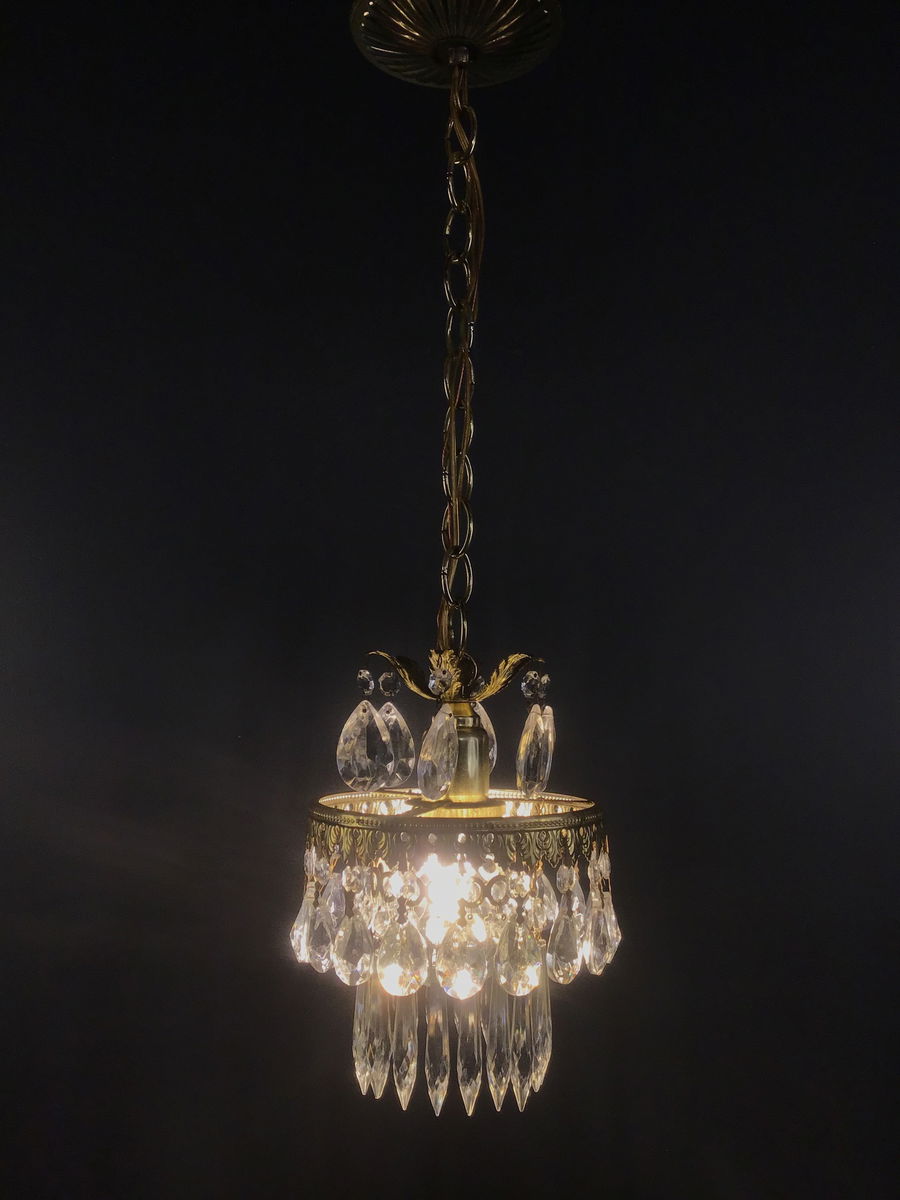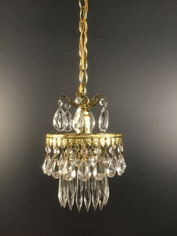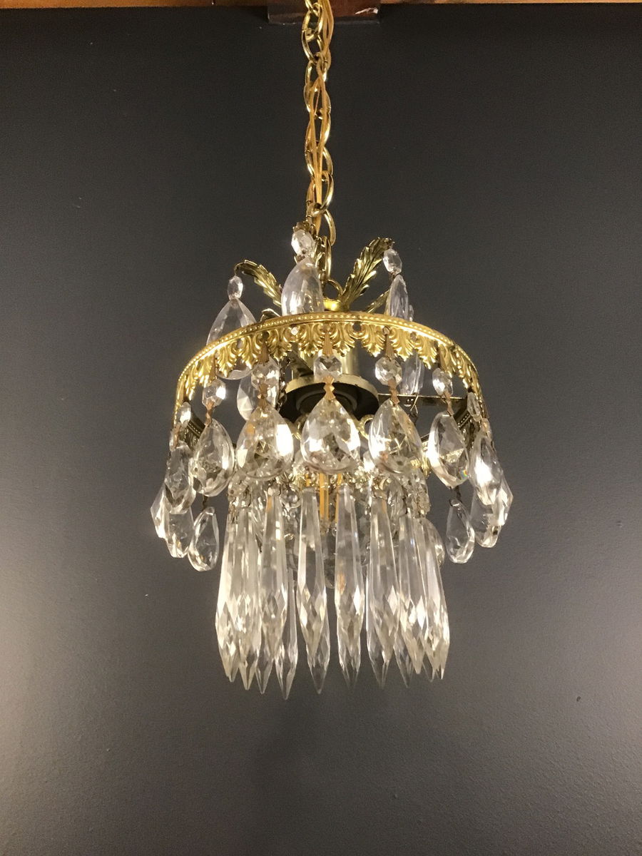 A lovely crystal pendant light made by Schonbek in the 1970s. A gold toned base dripping with pendalogue and icicle crystals on this wonderful Hollywood Regency style pendant light that was restored in our on site light repair workshop. Some of the finish is a bit tarnished, which is common for items if this era, but still looks gorgeous! The condition was taken into account when pricing.
