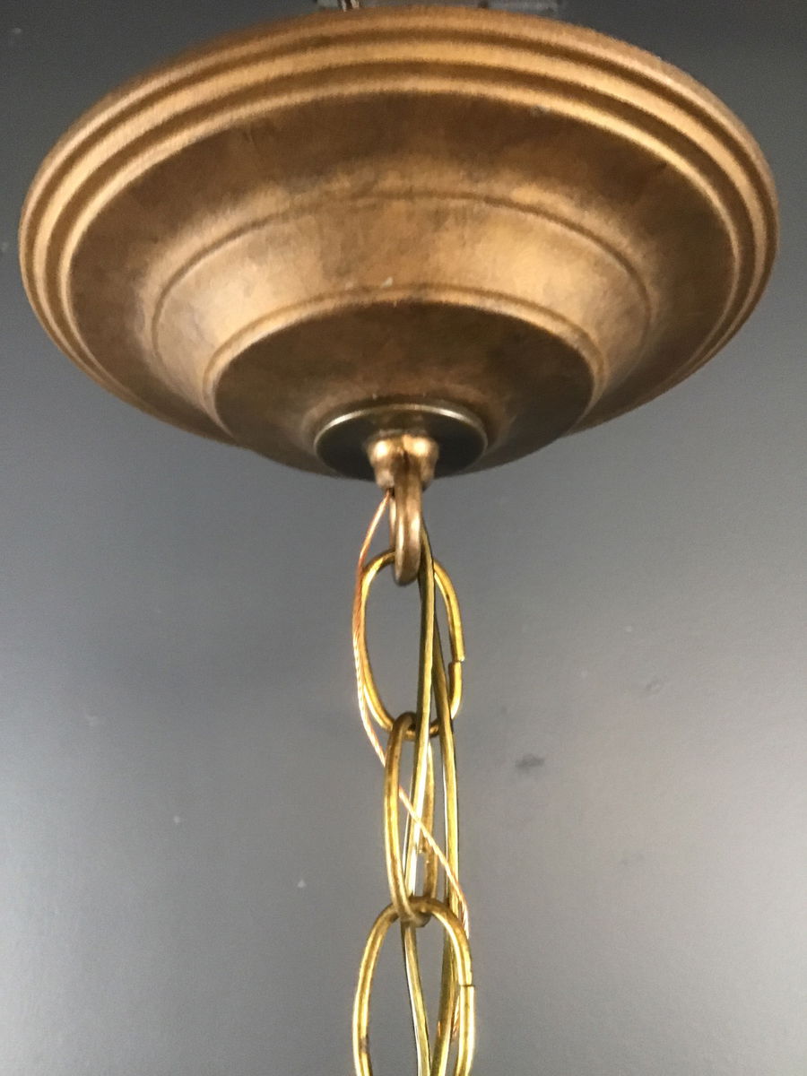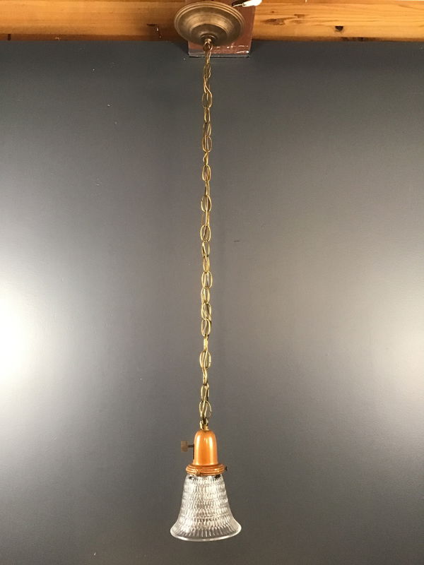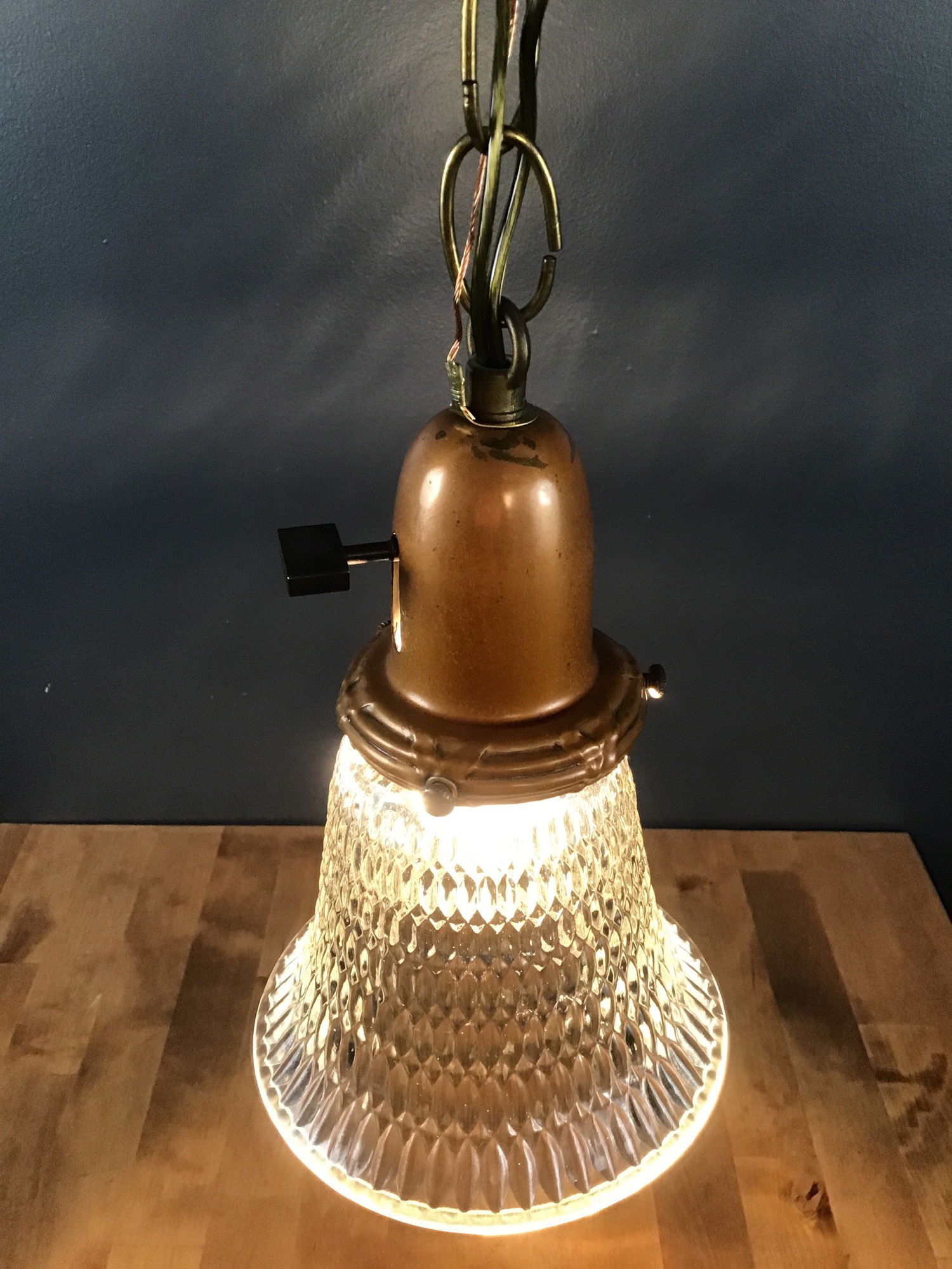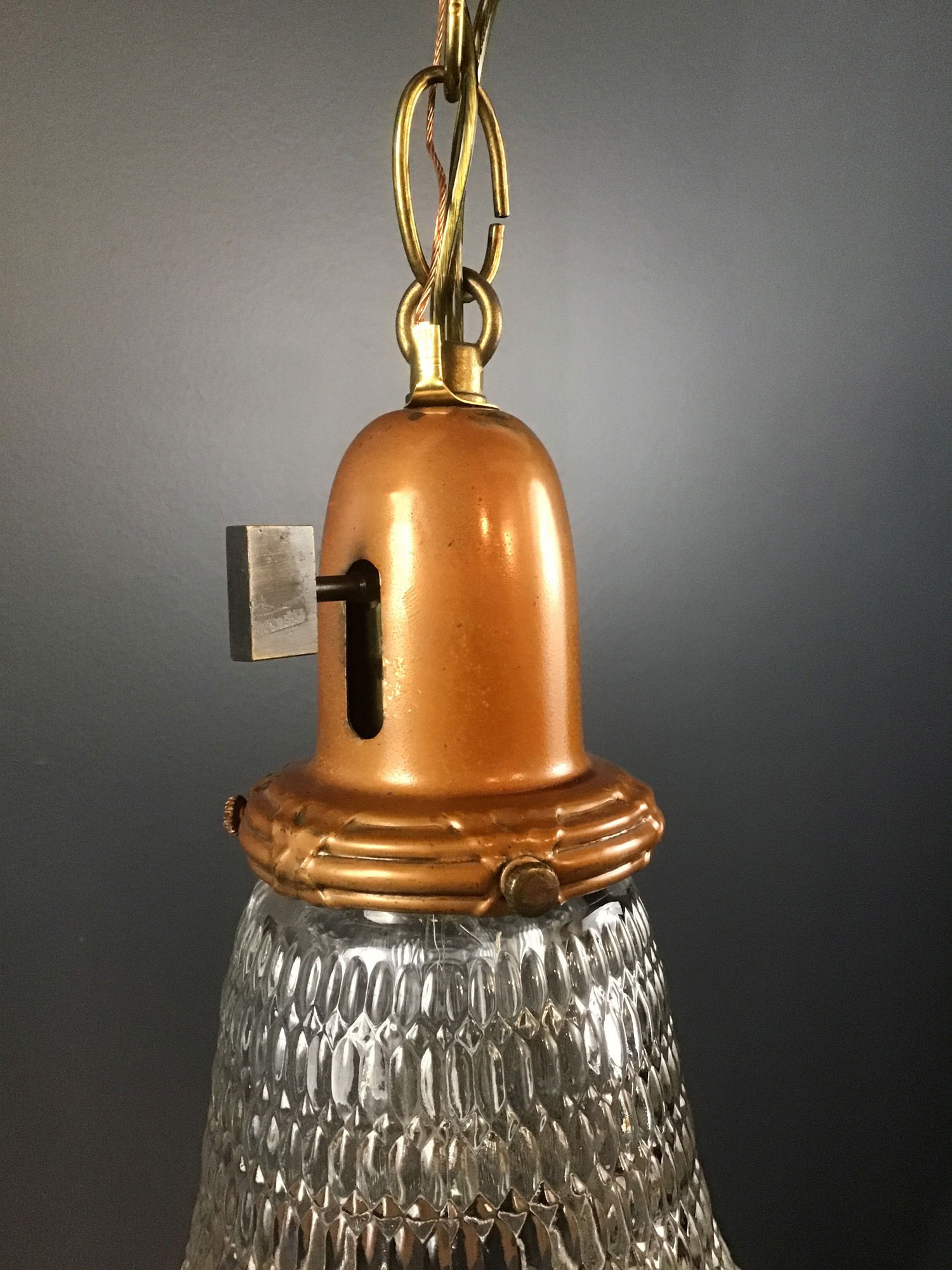 Diamond cut shades (5" diameter x 7.5" tall) paired with copper colored vintage fitters, and 30" chain. This is (1) of (3) similar pendants, using the same diamond cut glass shades and copper fitters. Each pendant ends up being unique, using a few different parts for their mounting canopies.
