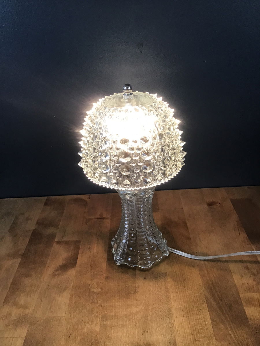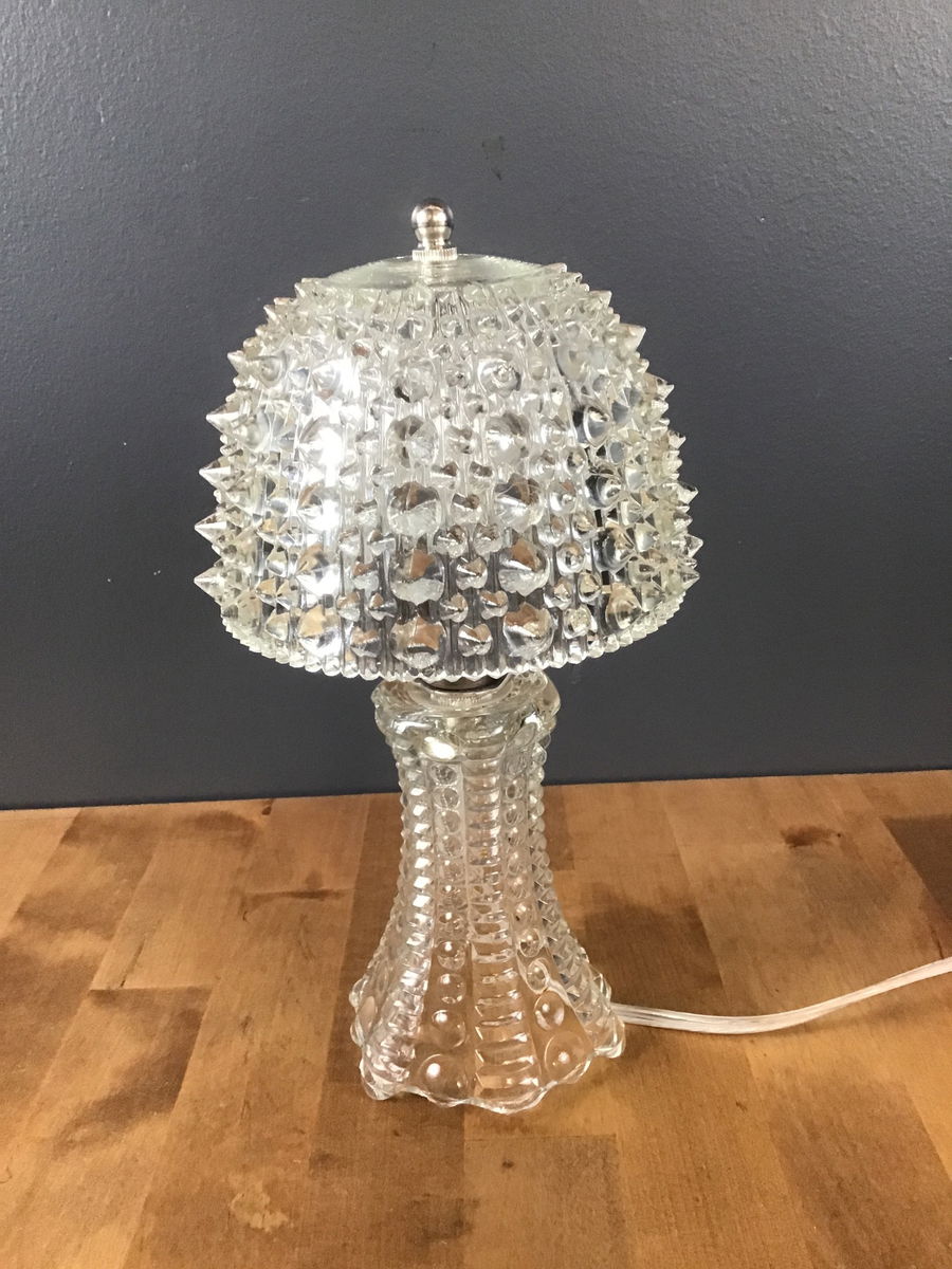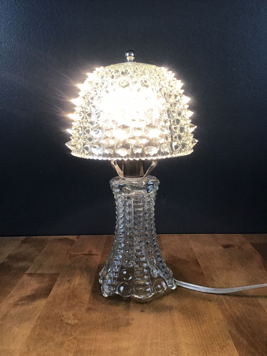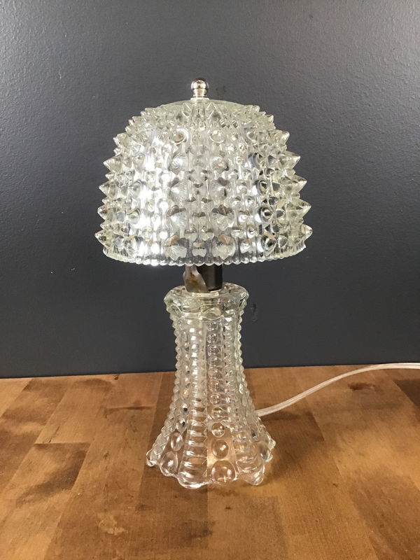 A beautiful all glass lamp. The shade is vintage 1940s Rostrato Murano glass, and the base was made in our on site light repair workshop to mimic the original lamp that would have gone with the shade. This is a one of a kind lovely!