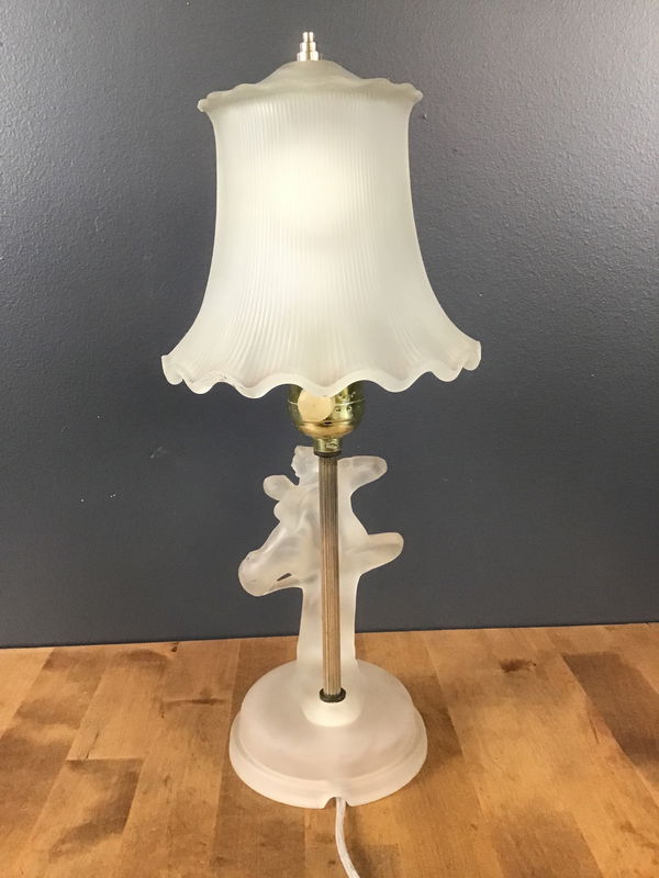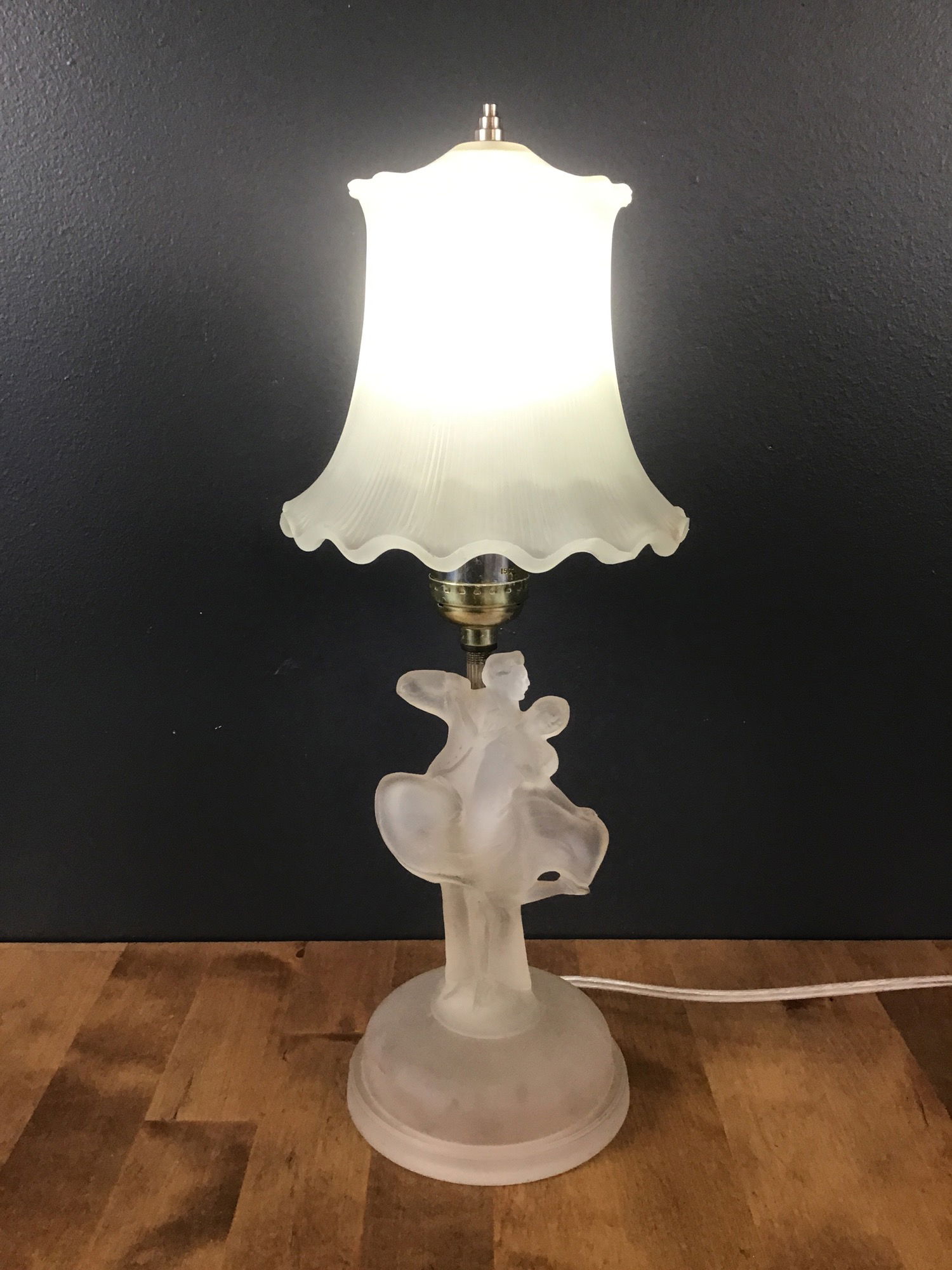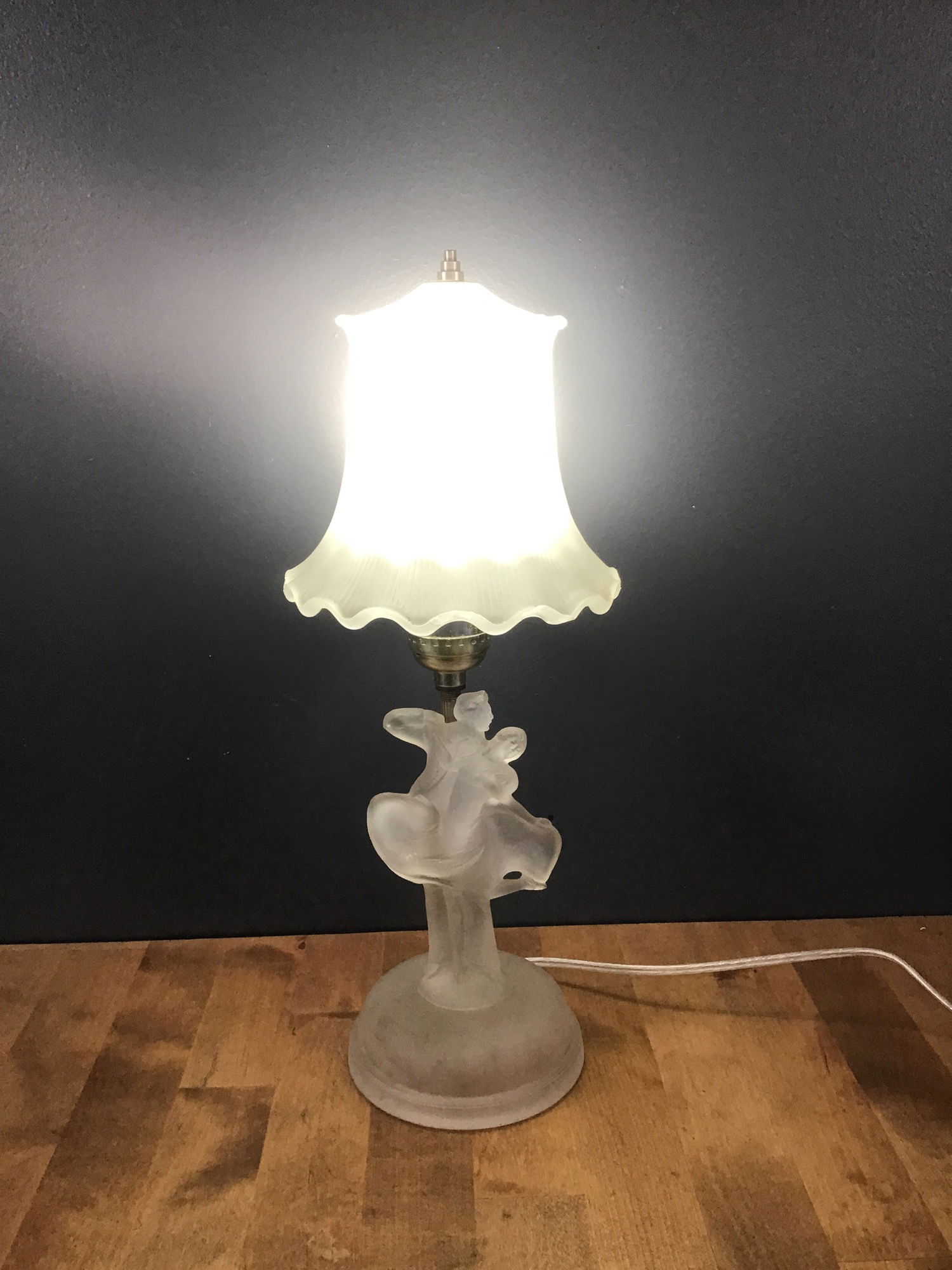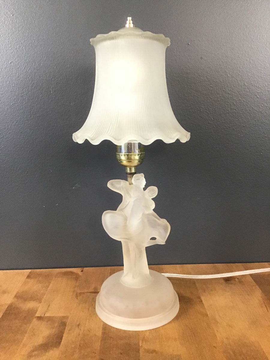 A lovely frosted glass bedside lamp featuring a frosted base in the shade of a couple dancing, and a matching frosted glass shade with a dimmer switch. Has been restored in our on site light repair workshop.