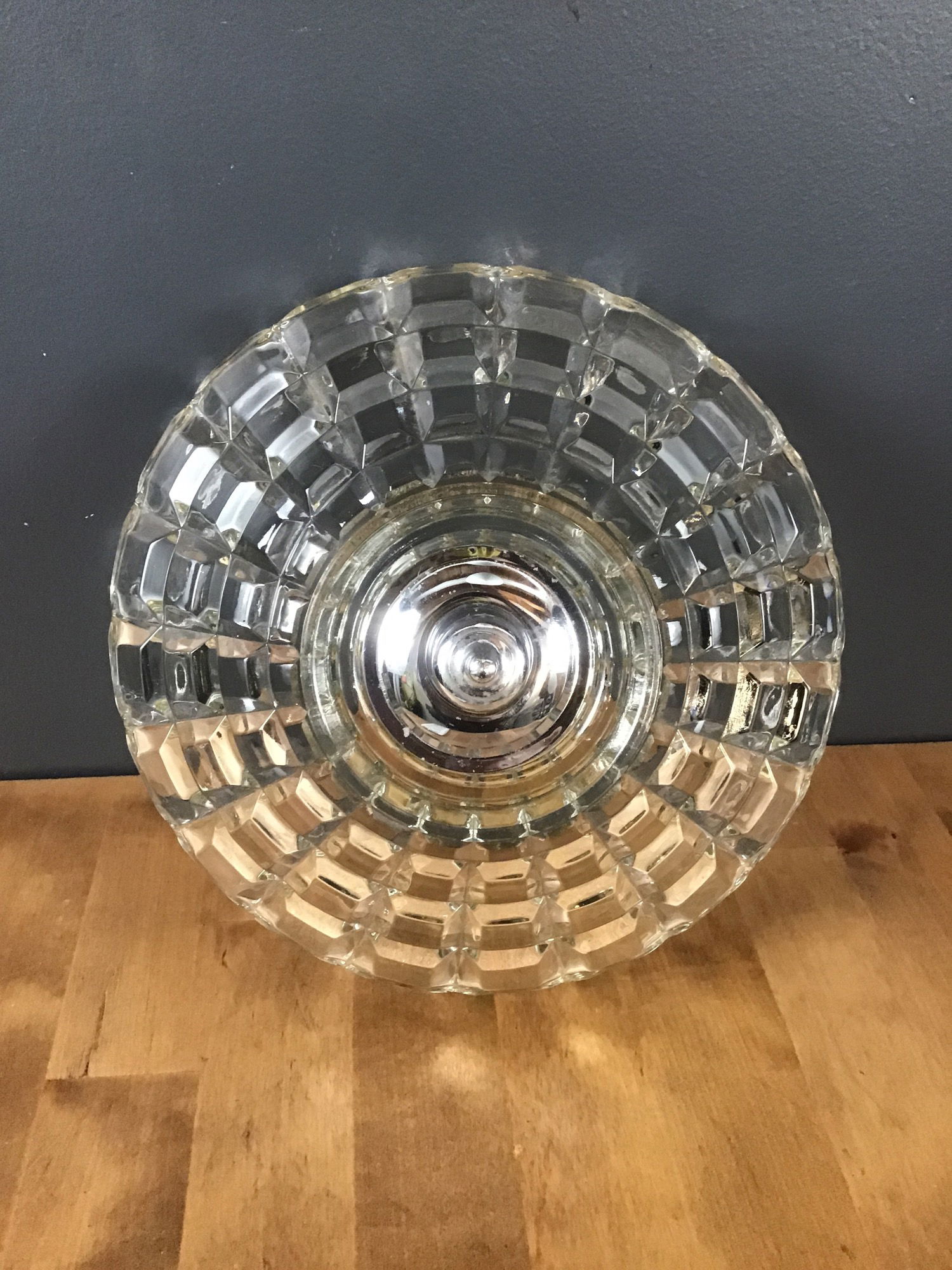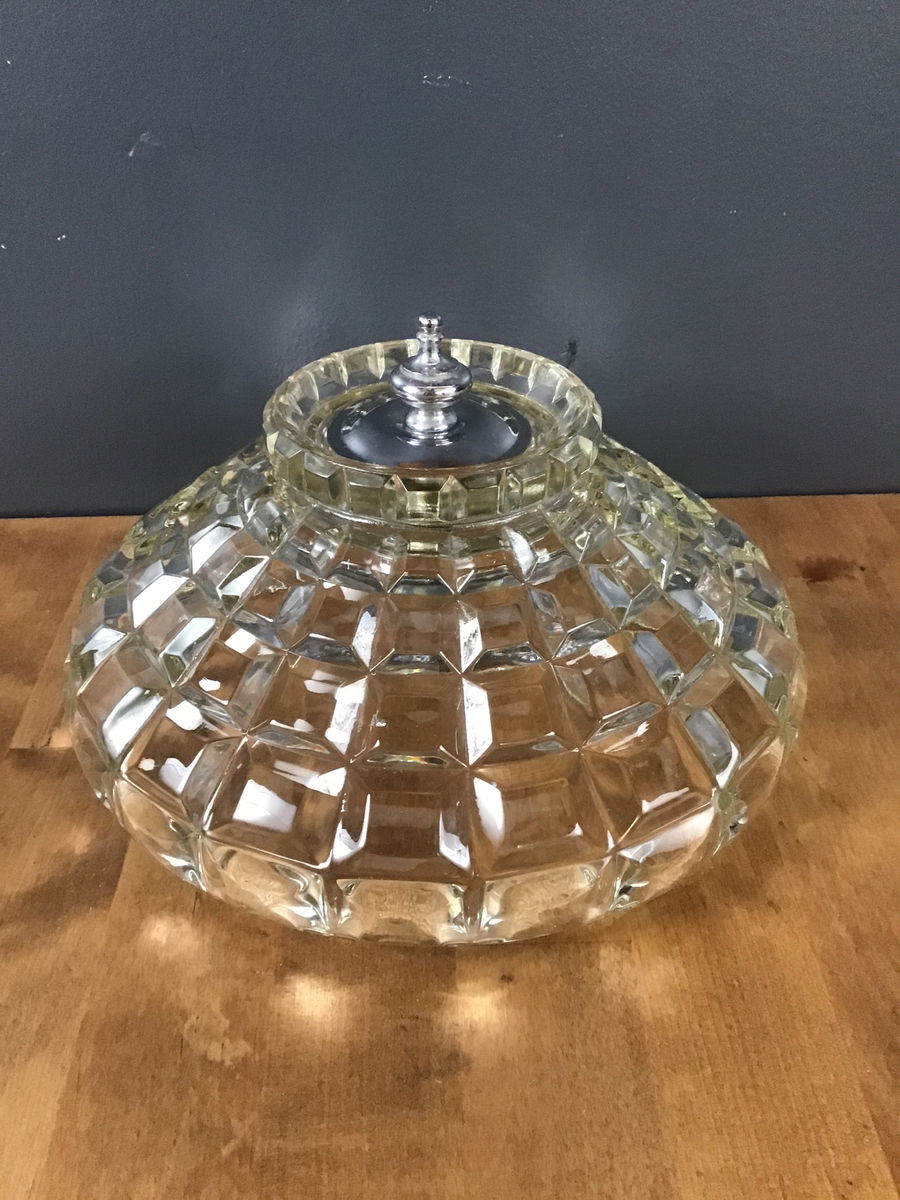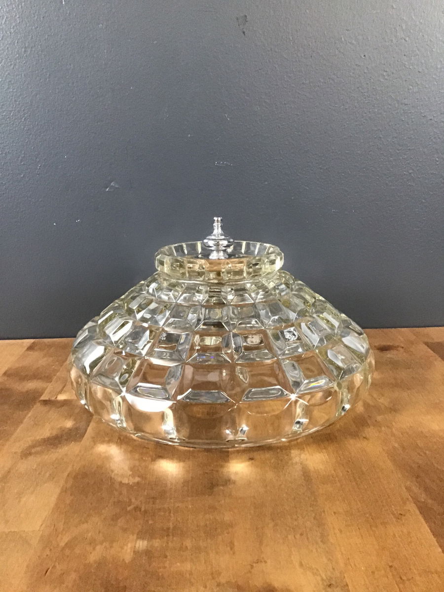 A beautiful leaded glass ceiling light shade with a cross hatch design and nickel accessories.