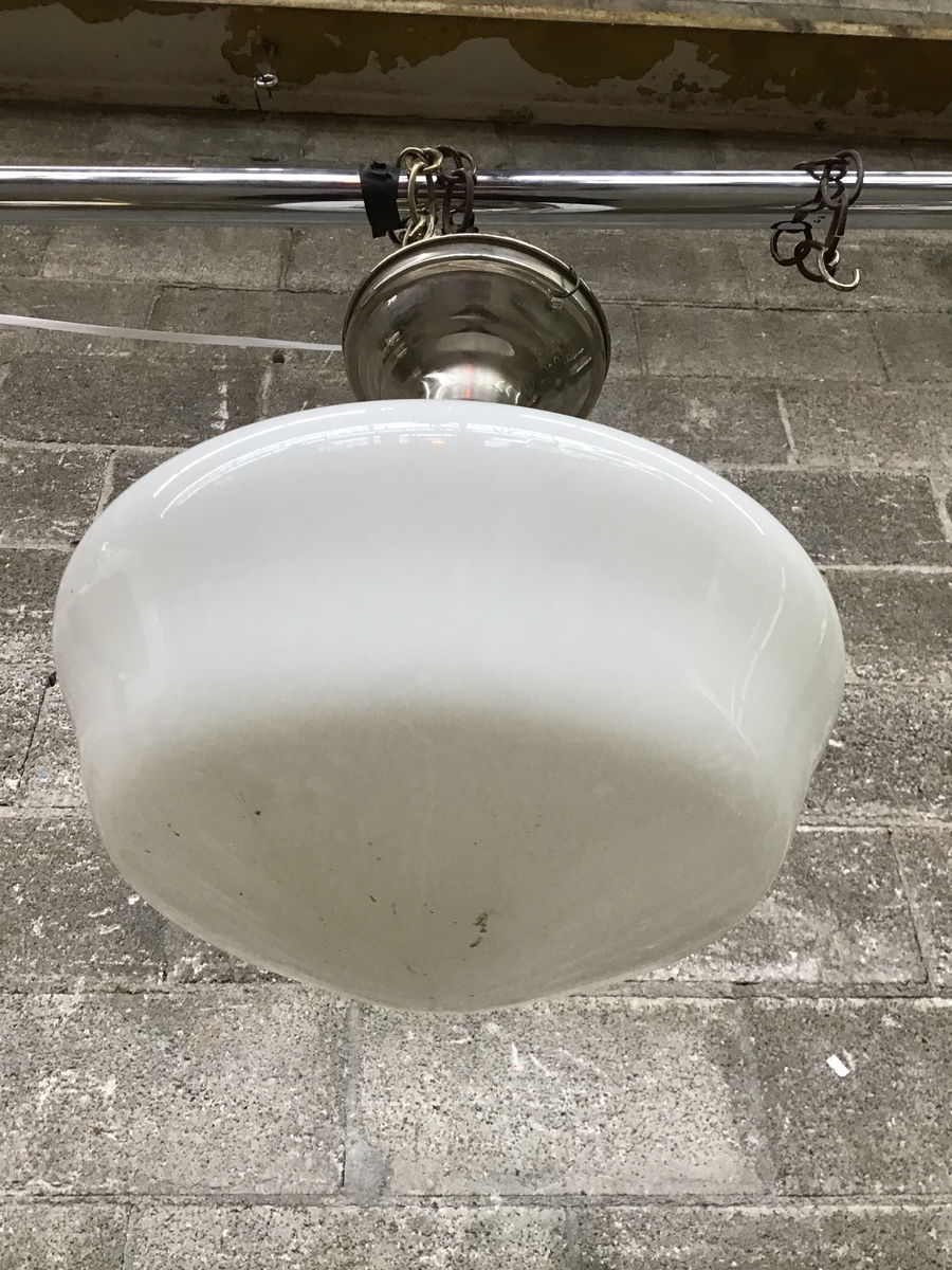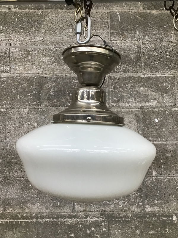 Semi flush mount ceiling light with a polished nickel fitter and schoolhouse shade. This will need a new mounting bracket but appears to be in good shape otherwise. Suitable for dry locations only.