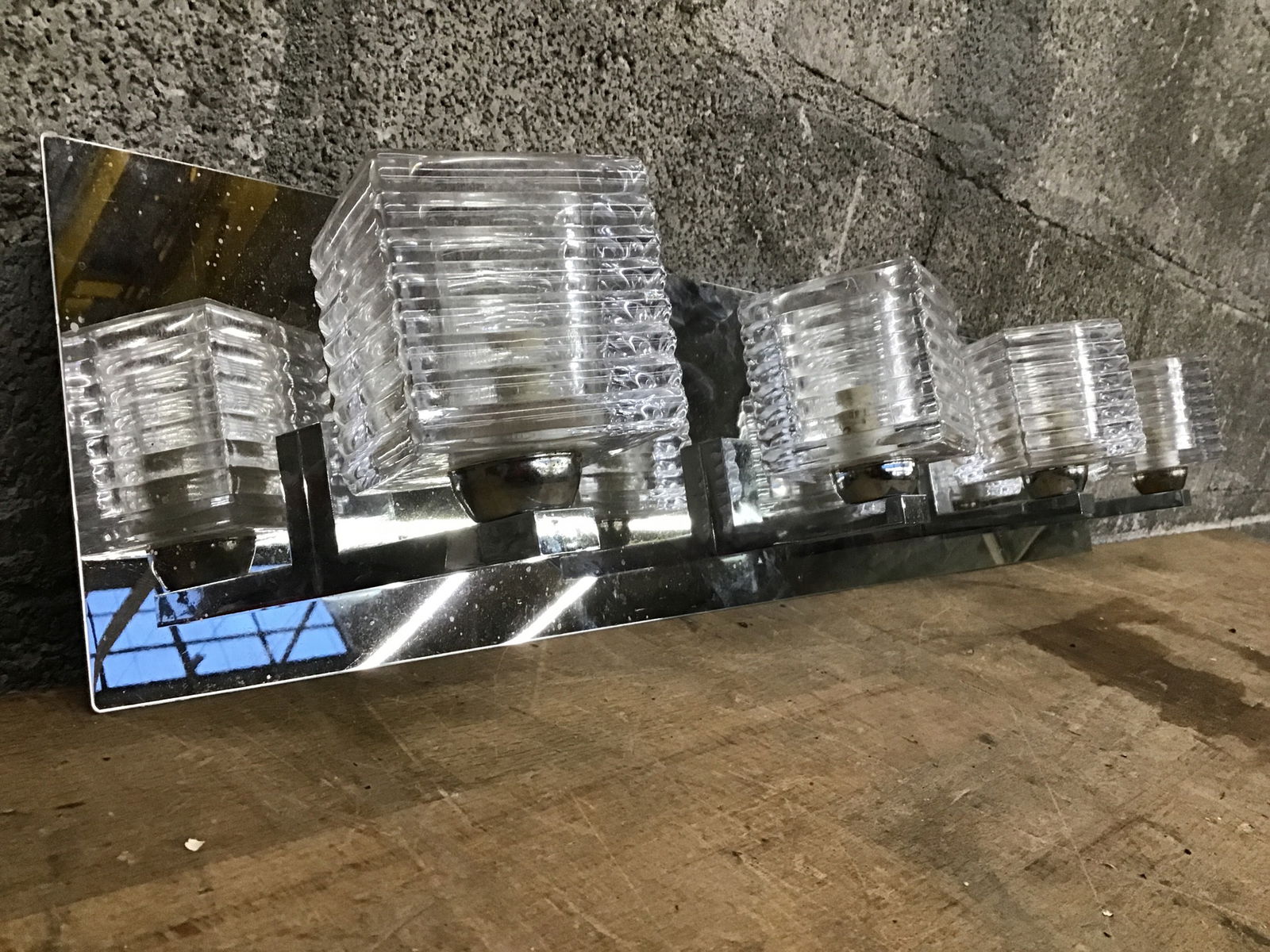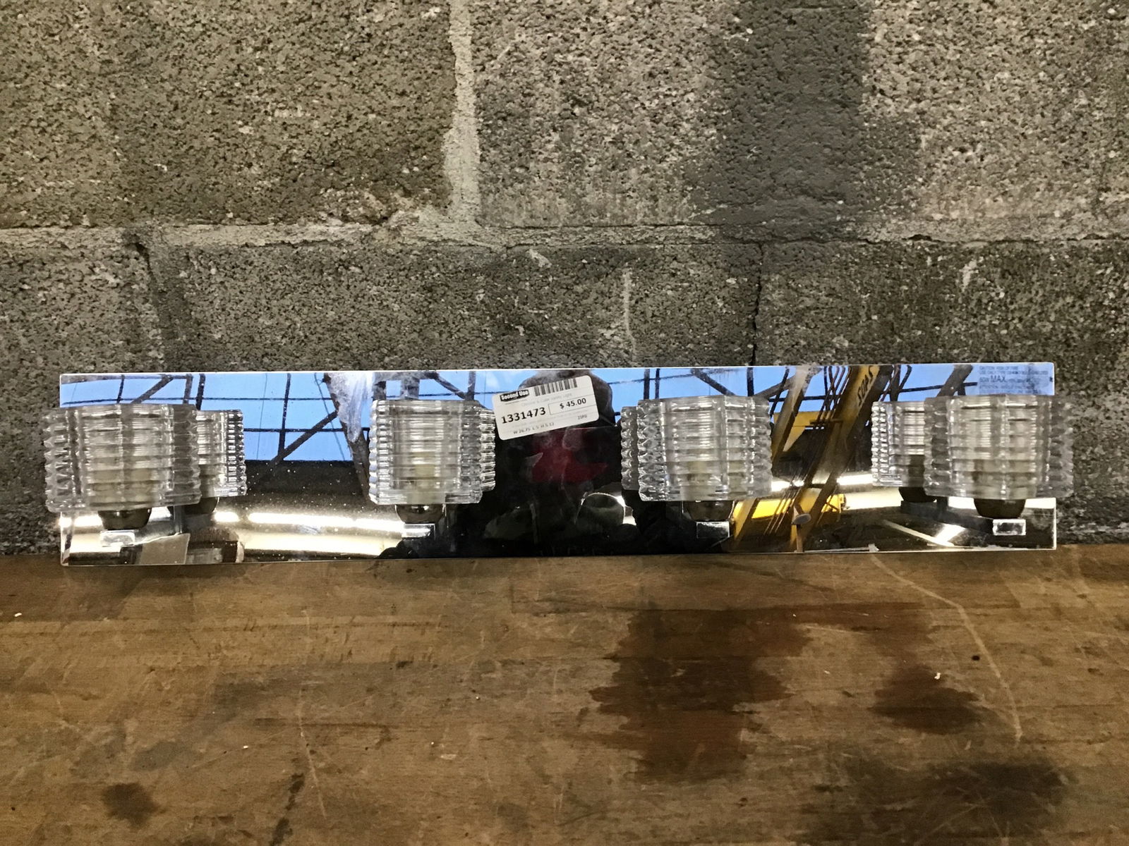 A four-bulb vanity with a chrome finish to its construction and a ribbed glass cube fitter for each bulb. Retails new for about $110.