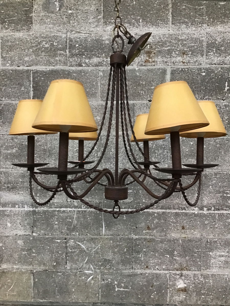 This chandelier has 6 arms that each have tan paper shades. The chandelier itself has a cool faux rusted patina and cast iron style twists.