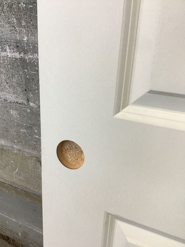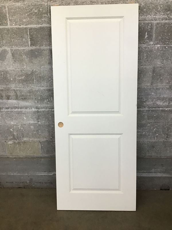Faux raised two panel hollow core door that has no hinge cuts, but does have a bore for a bypass door insert "handle" on one face at 2 3/8" backset. Could be completed for a knob set.