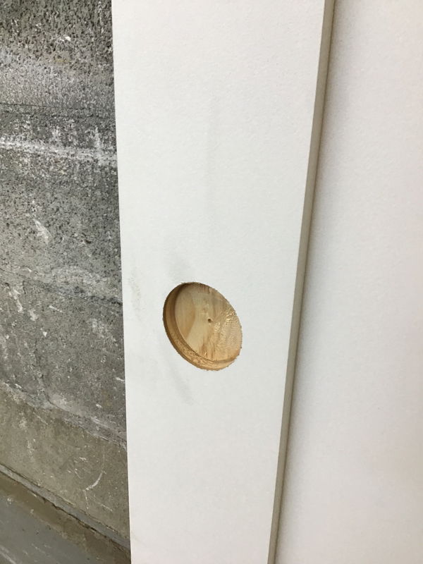 Undrilled for hinges, primed masonite, Shaker style one panel door that has been partially bored for a bypass door insert "handle" at 2 3/8" backset, which could be completed for a knob set.