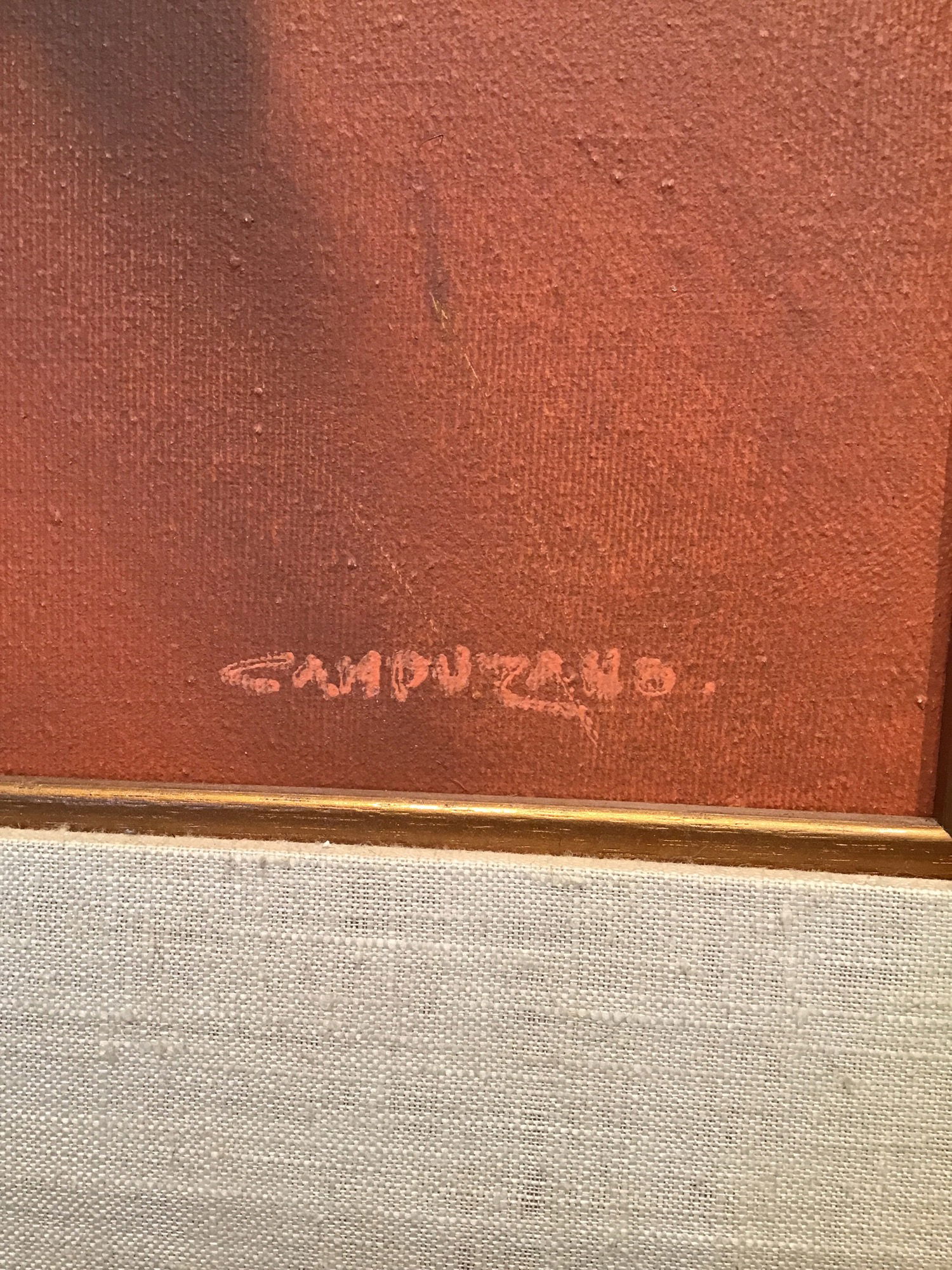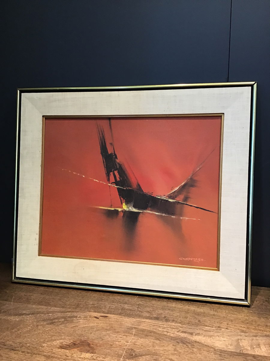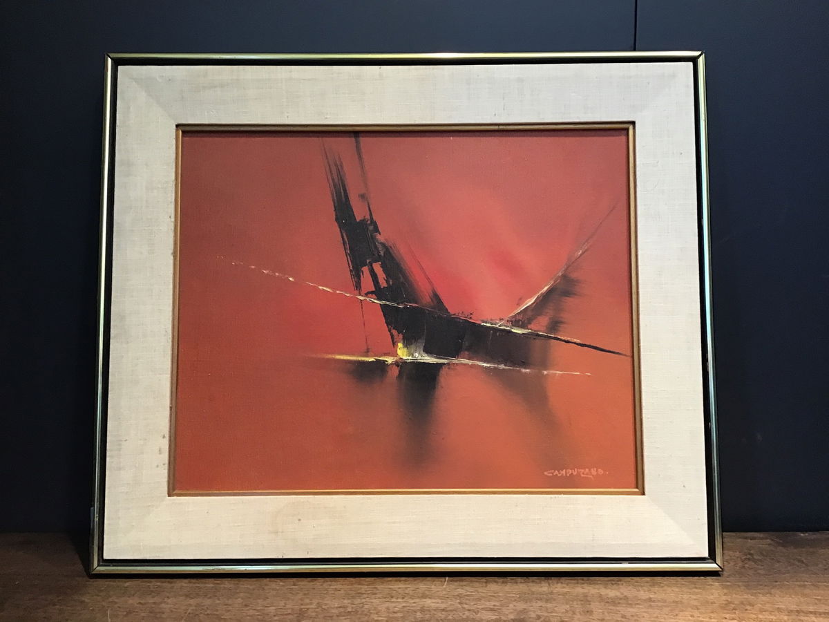 Jose Luis Campuzano was a 20th century artist from Spain, who's paintings of South American coastal cities and ports were displayed and exhibited all across South America in the 1950s. Eventually settling in New York City, he began to experiment with abstracts, like we see here. This is a Campuzano original abstract on canvas and beautifully framed with a large fabric border and gold trim. This piece shows a stark red background with a harsh black figure in the center with hints of yellow and white. Artist signature on bottom right corner. Original Campuzanos range anywhere from $200-$1500 at auction.