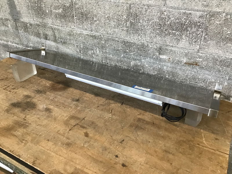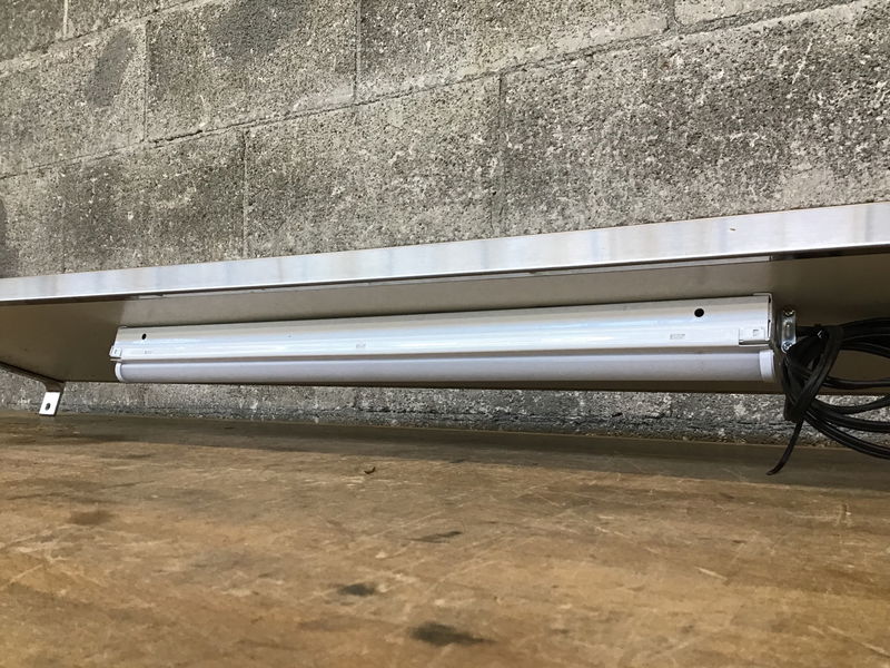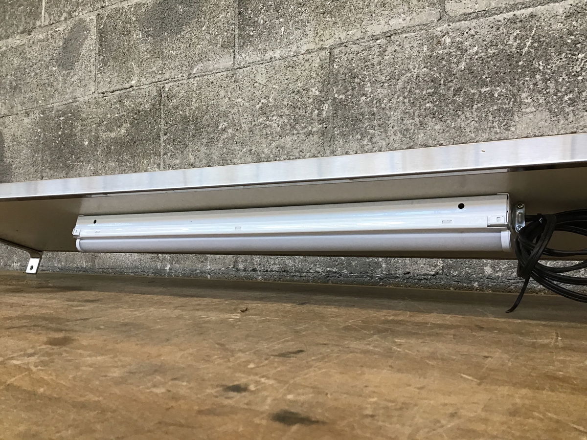 A shelf wrapped in stainless steel, with brackets for wall-mounting and a little LED bar light on the underside to light up your workspace.