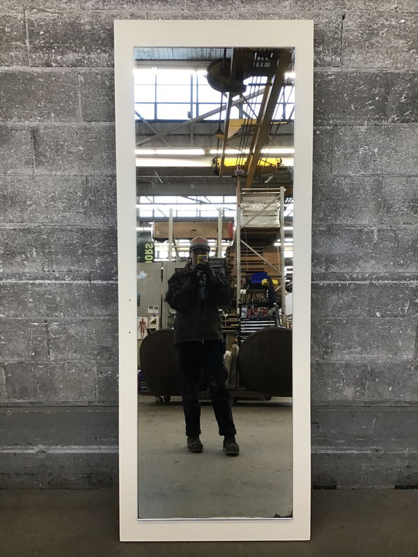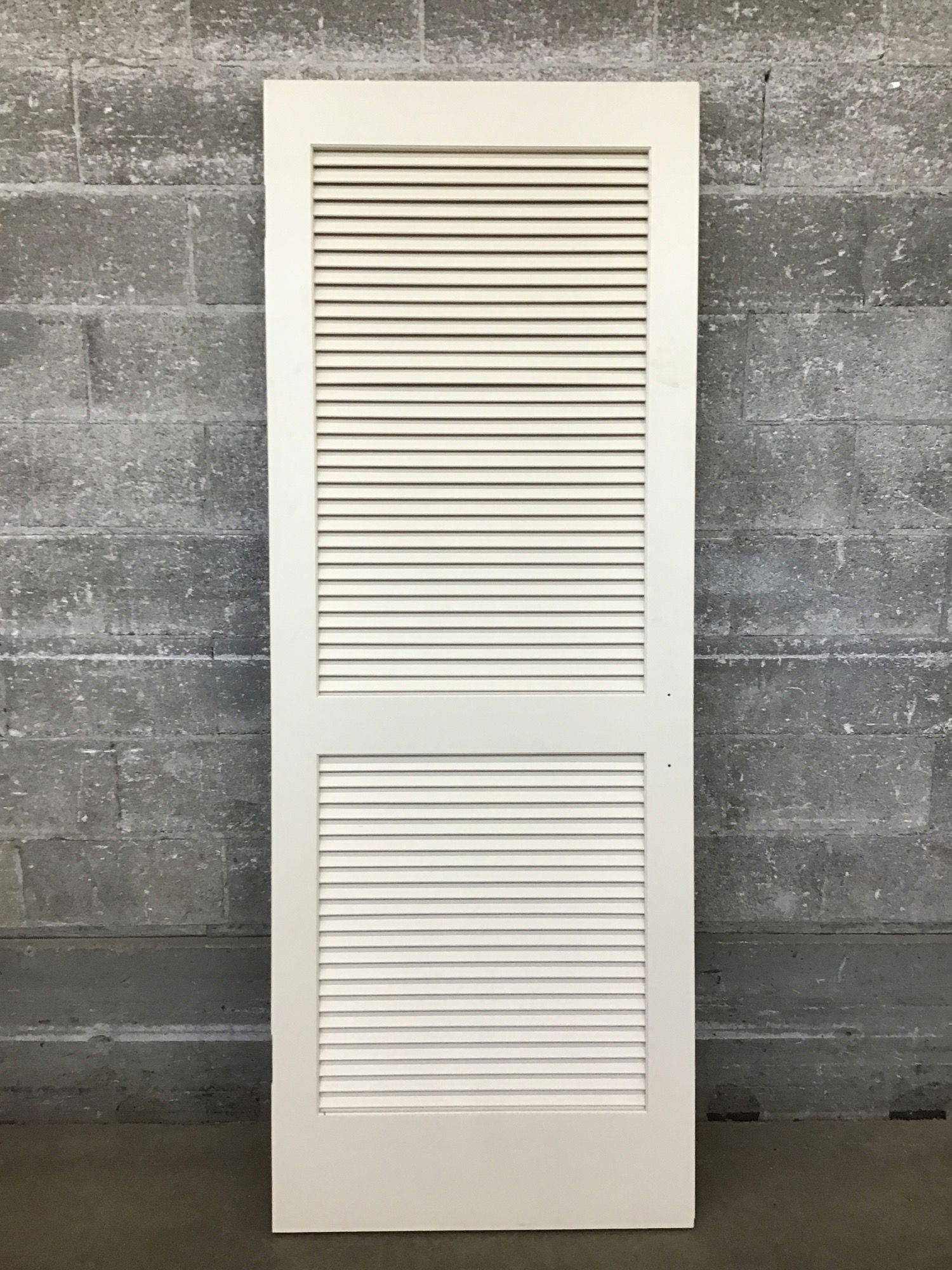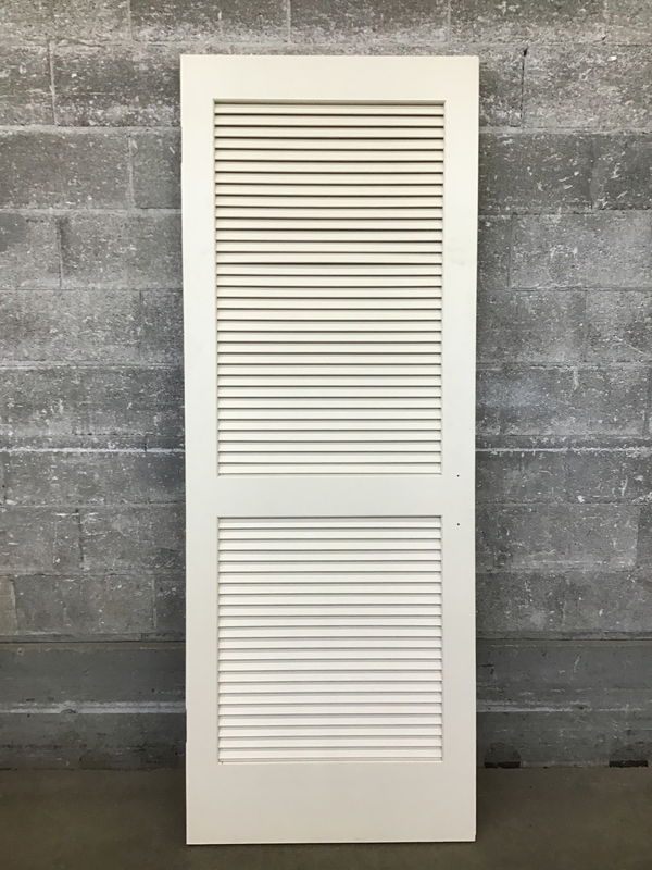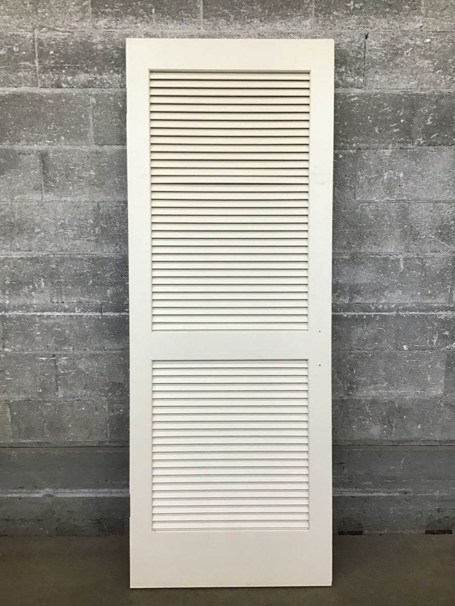 Louvered Interior Closet Door with mounting pins at the top and bottom. Painted with a coat of tan paint. Has a full body mirror on one side.