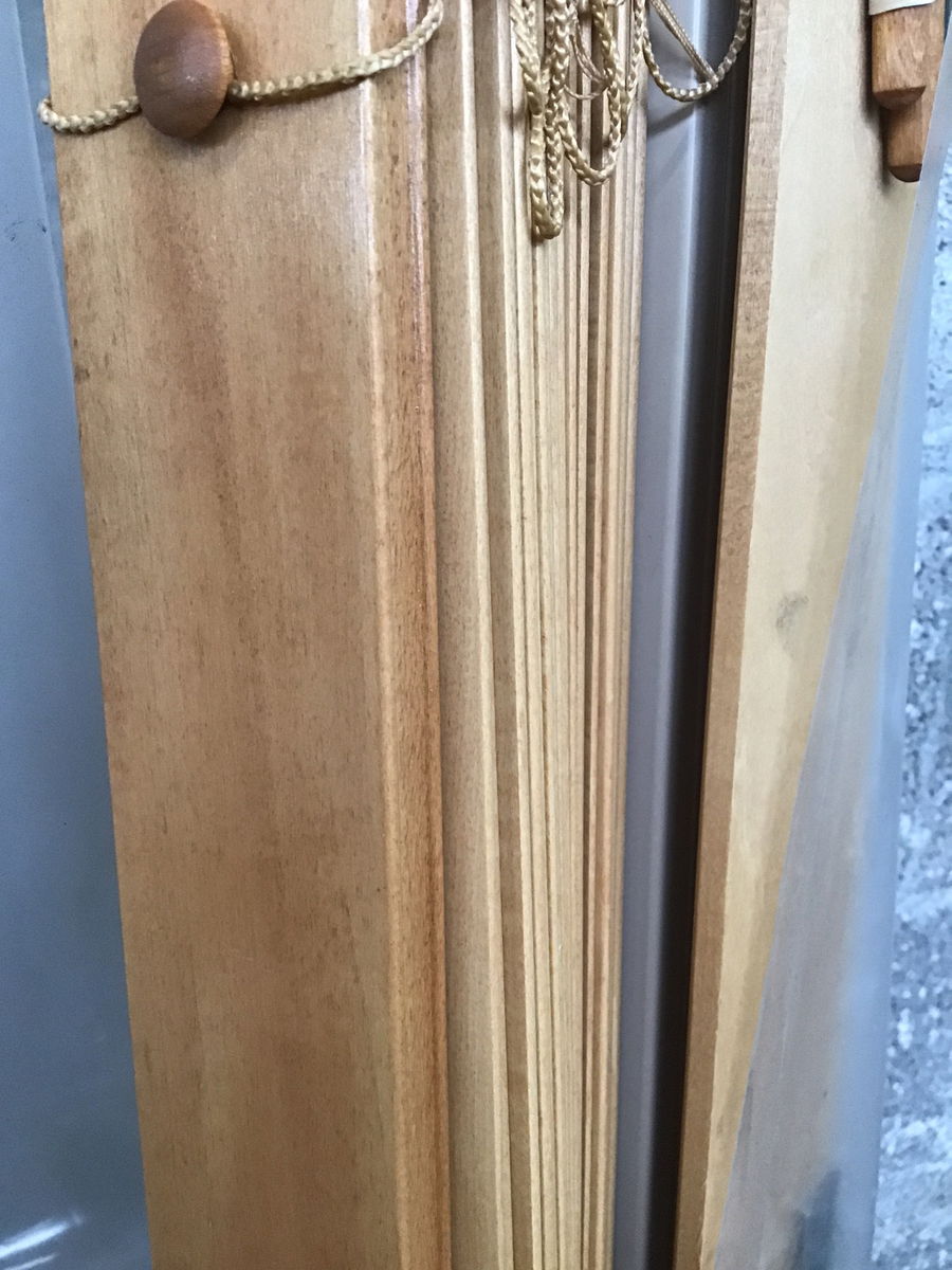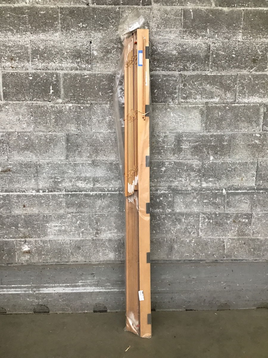 Never installed wood slat blinds, 82" wide. The blinds are split into 2 sections for easier operation. These have a manufacture date of '02 on them, but they're still in the original delivery package and look like they've been stored well. Includes installation hardware and trim!