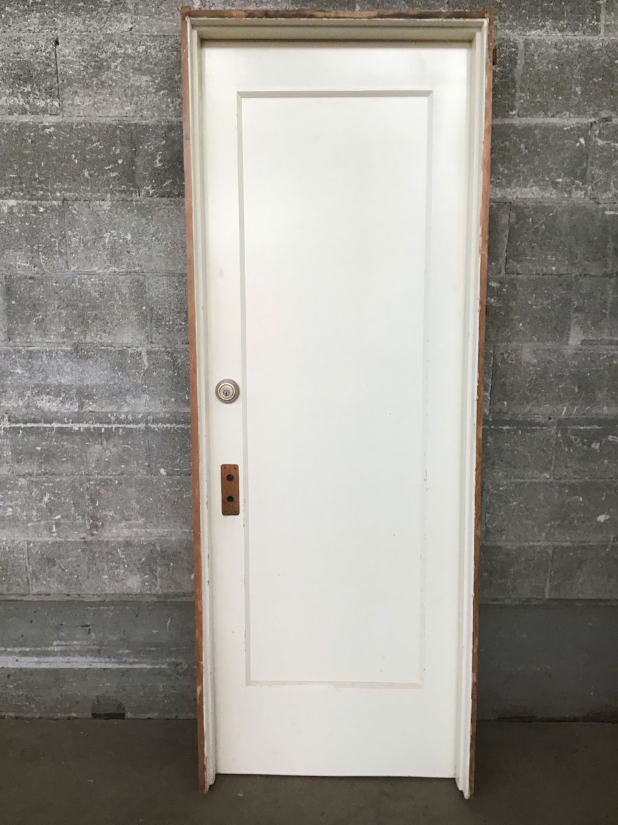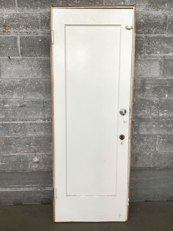 Recessed single panel interior door in a fir jamb with ball finial hinges. Bored for a deadbolt.