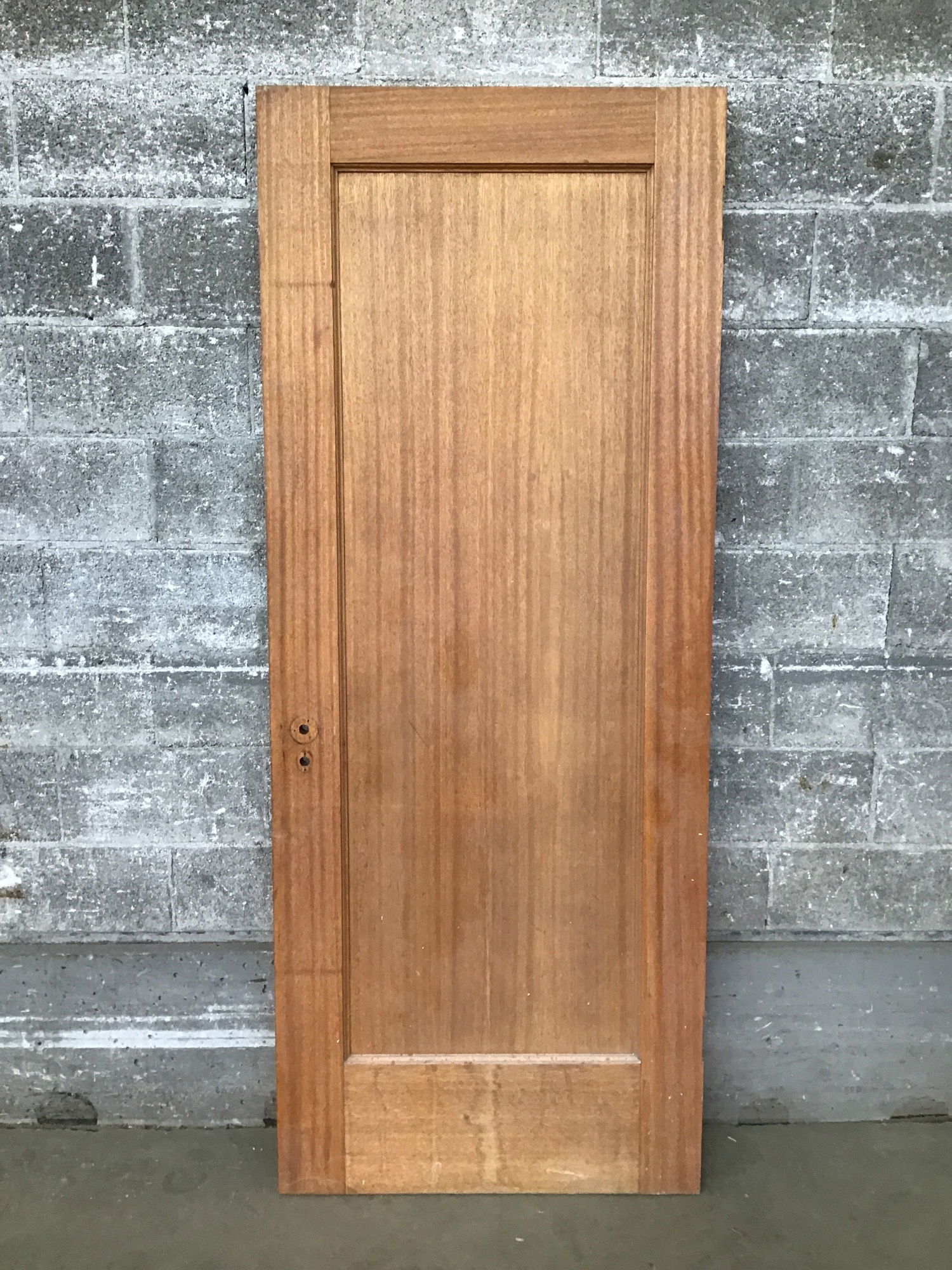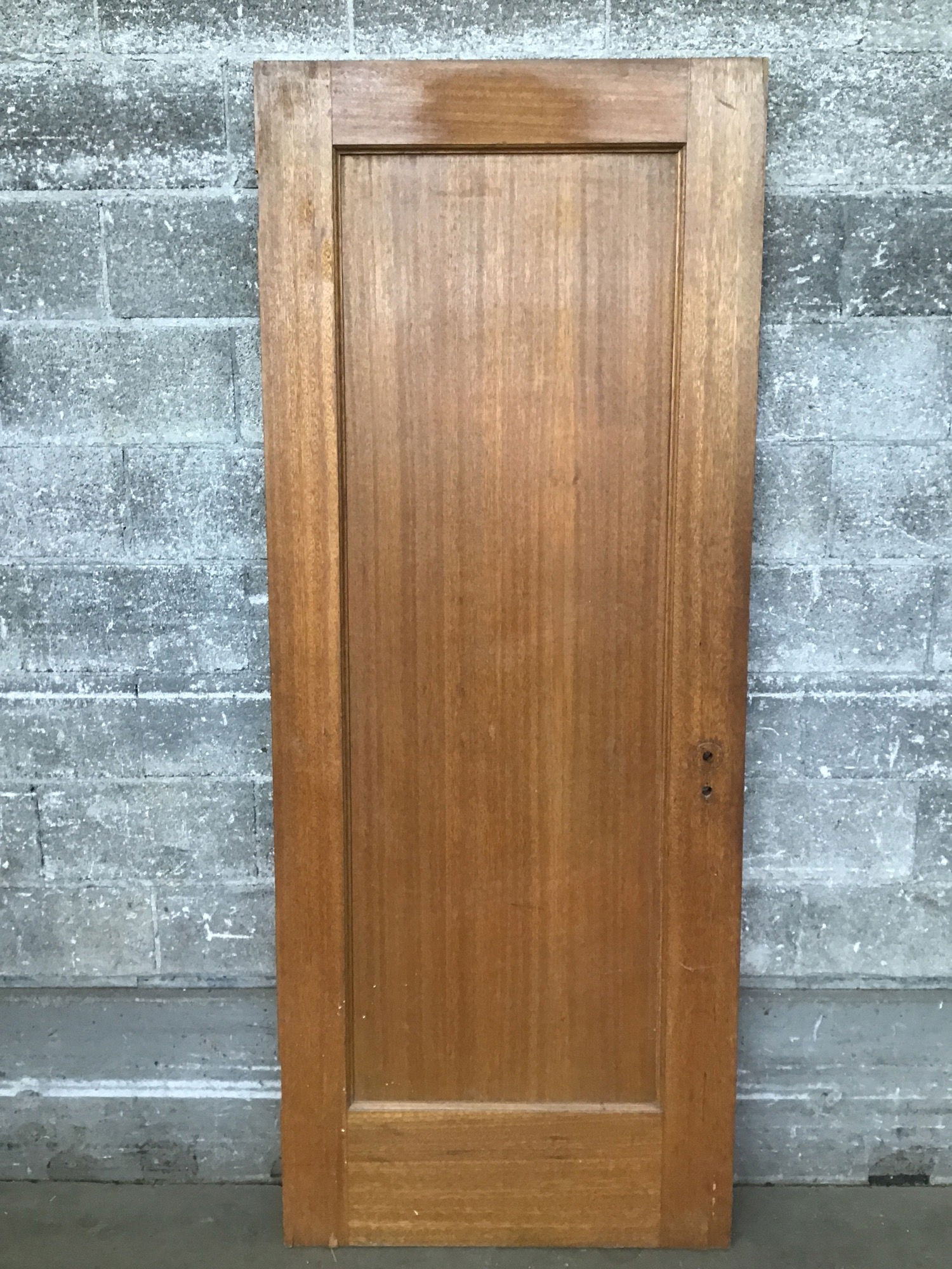 Handsome vintage recessed panel interior door with a stained mahogany veneer. The veneer is peeling just a bit along the bottom edge.