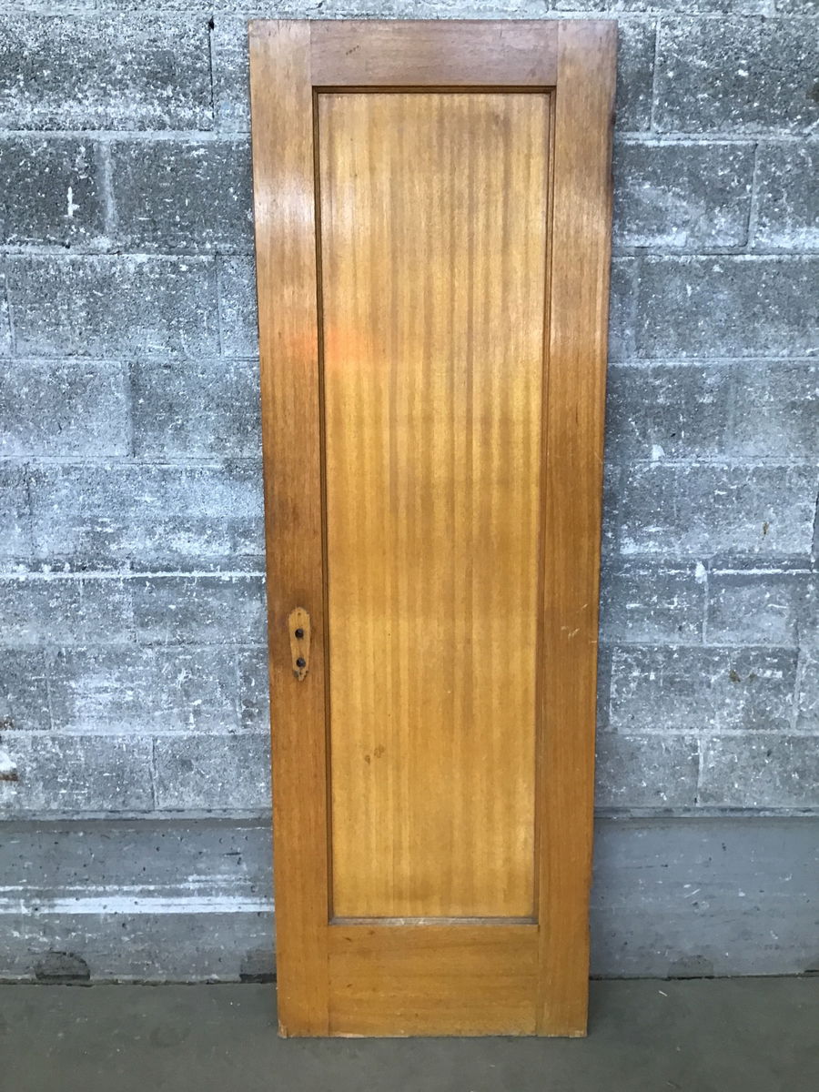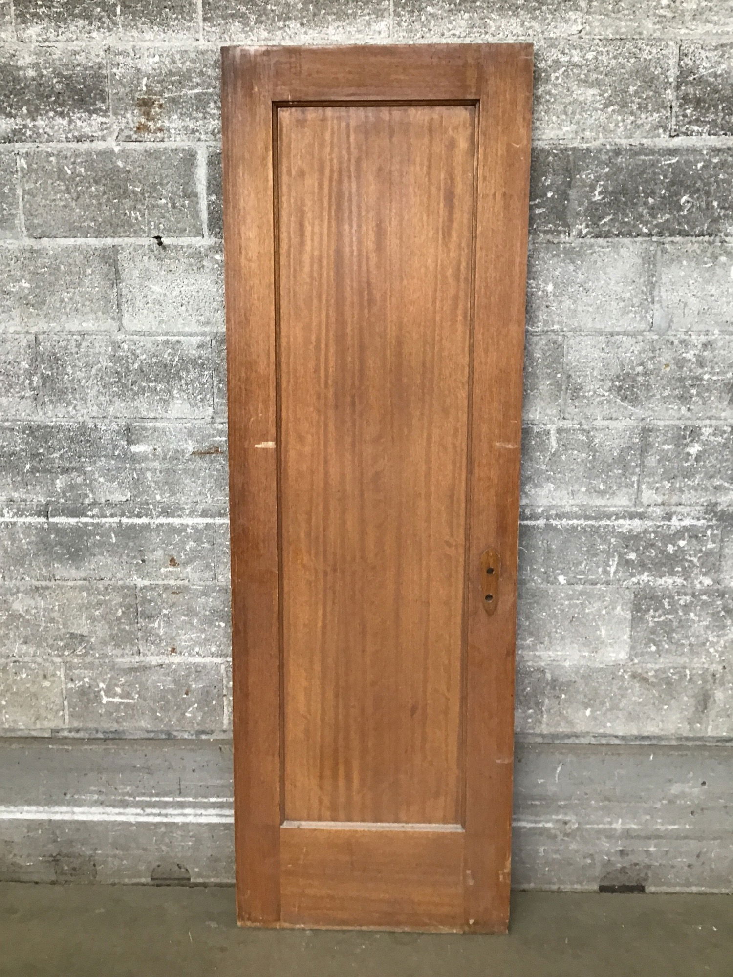 Handsome vintage recessed panel interior door with a stained mahogany veneer. The veneer is peeling just a bit along the bottom edge.