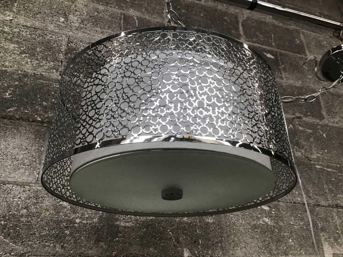 From Portfolio's Everly line, this hanging drum light features two drums around its two bulbs: an inner linen shade and an outer chrome-finished fitter with loopy little designs in it, and a sheet of frosted glass on the bottom.