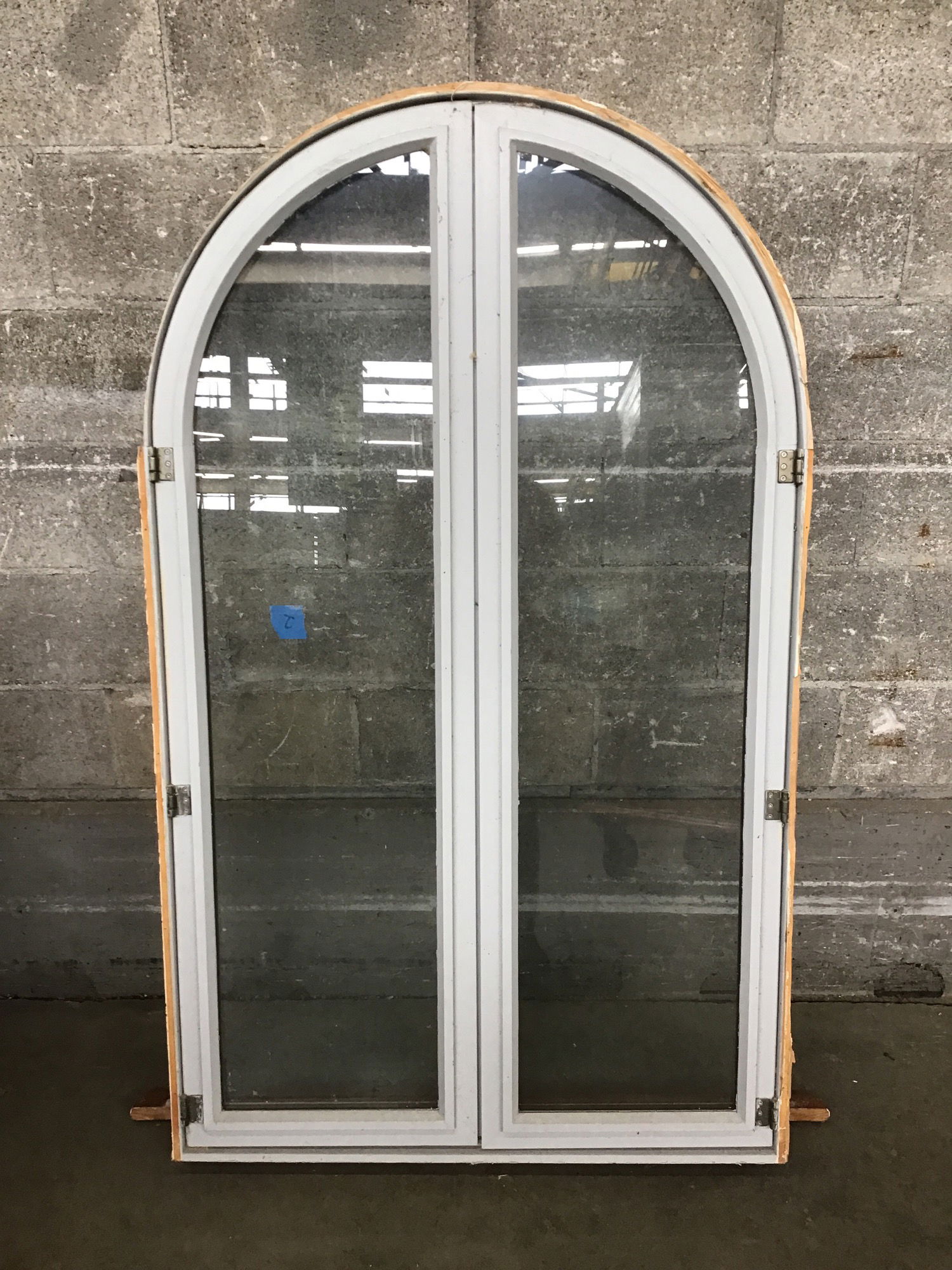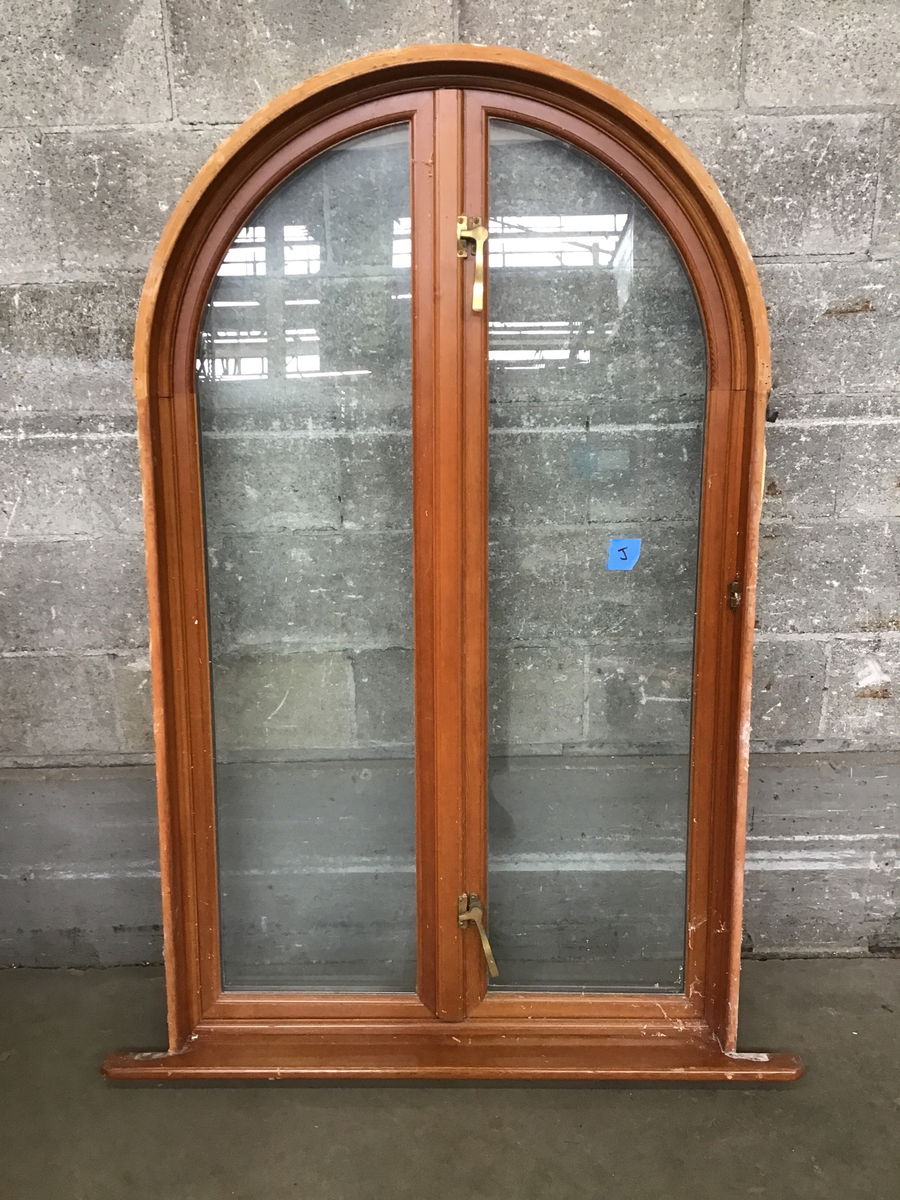 Beautiful custom arched fir casement window with at least some of its original trim package. So far, in spite of being probably a thirty year old window its seals are good and it is in good structural condition overall. This window would be a nice addition to a custom backyard shack. Photo may be representational.