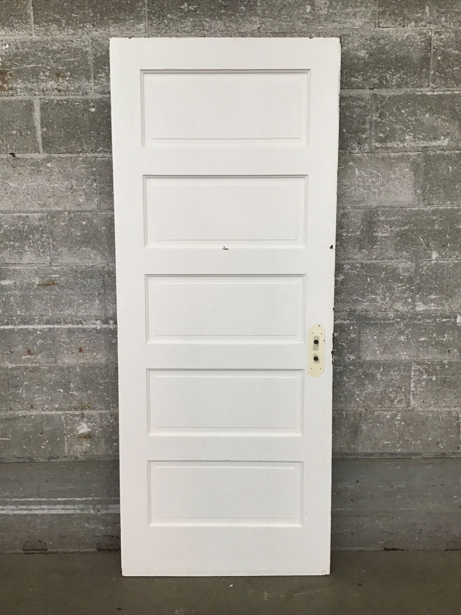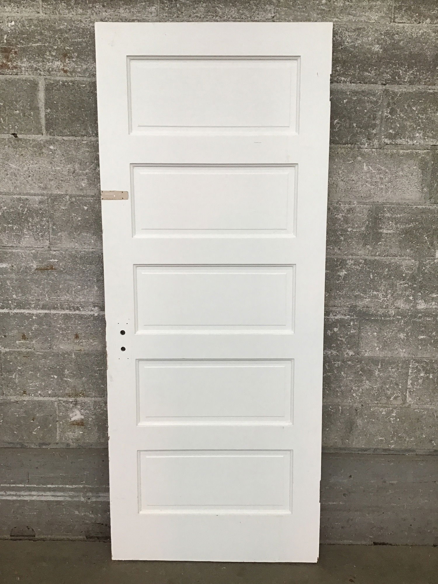 Painted fir, raised five panel that's a little wider than the usual 32". Could be shaved on the hinge side to give you a door with no hinge cuts--a blank slate for where you need them.