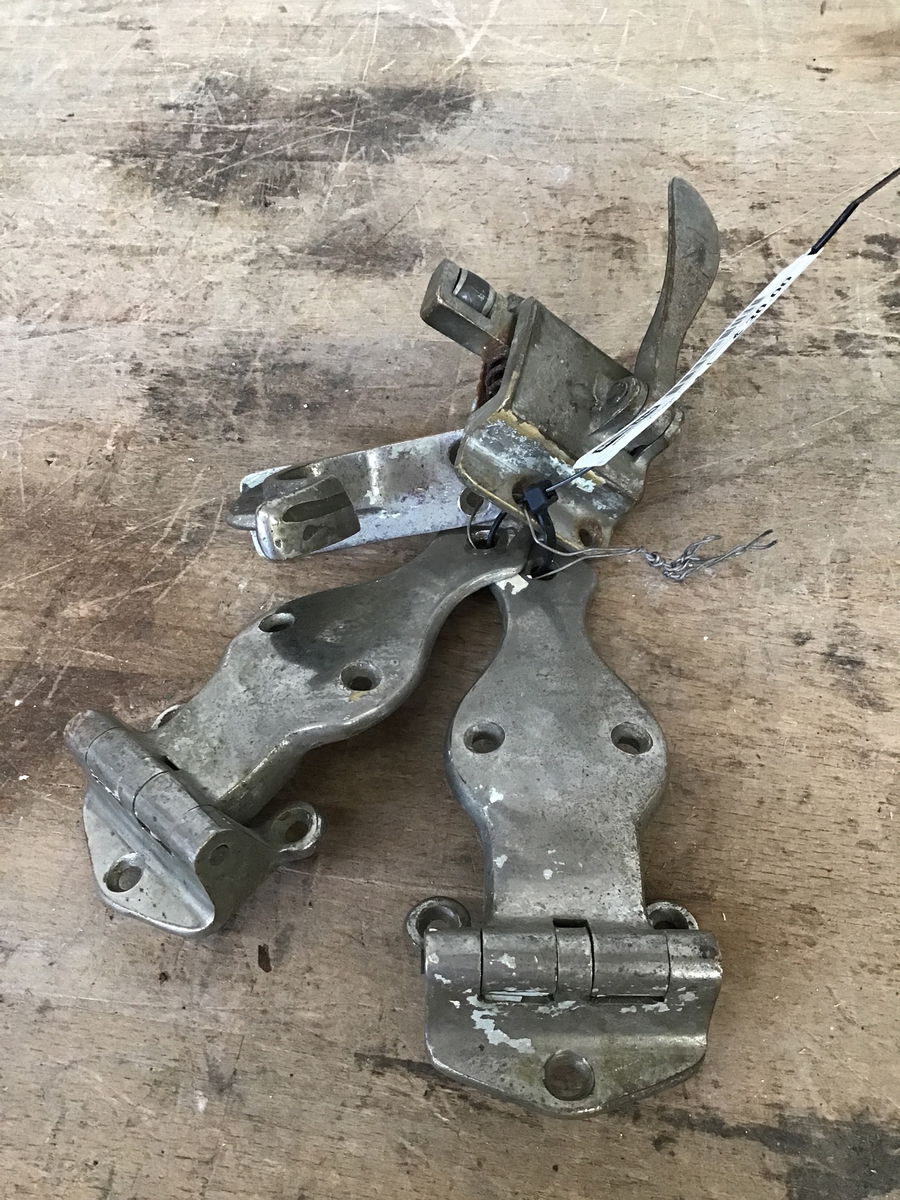 A set of vintage ice box hardware. Four pieces in total, includes two hinges, latch lock and latch lock holder.