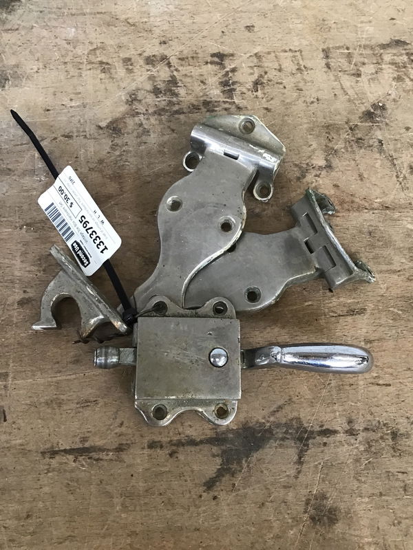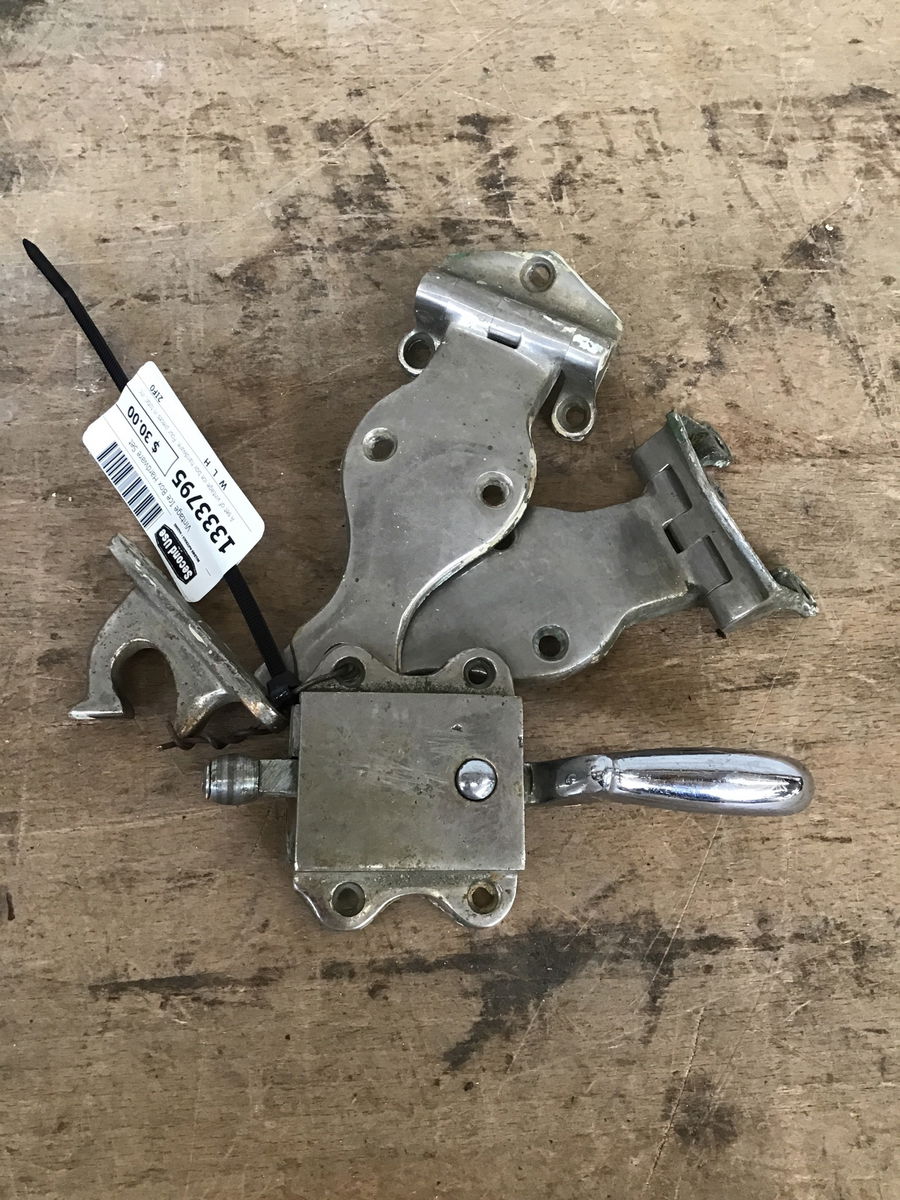 A set of vintage ice box hardware. Four pieces in total, includes two hinges, latch lock and latch lock holder.
