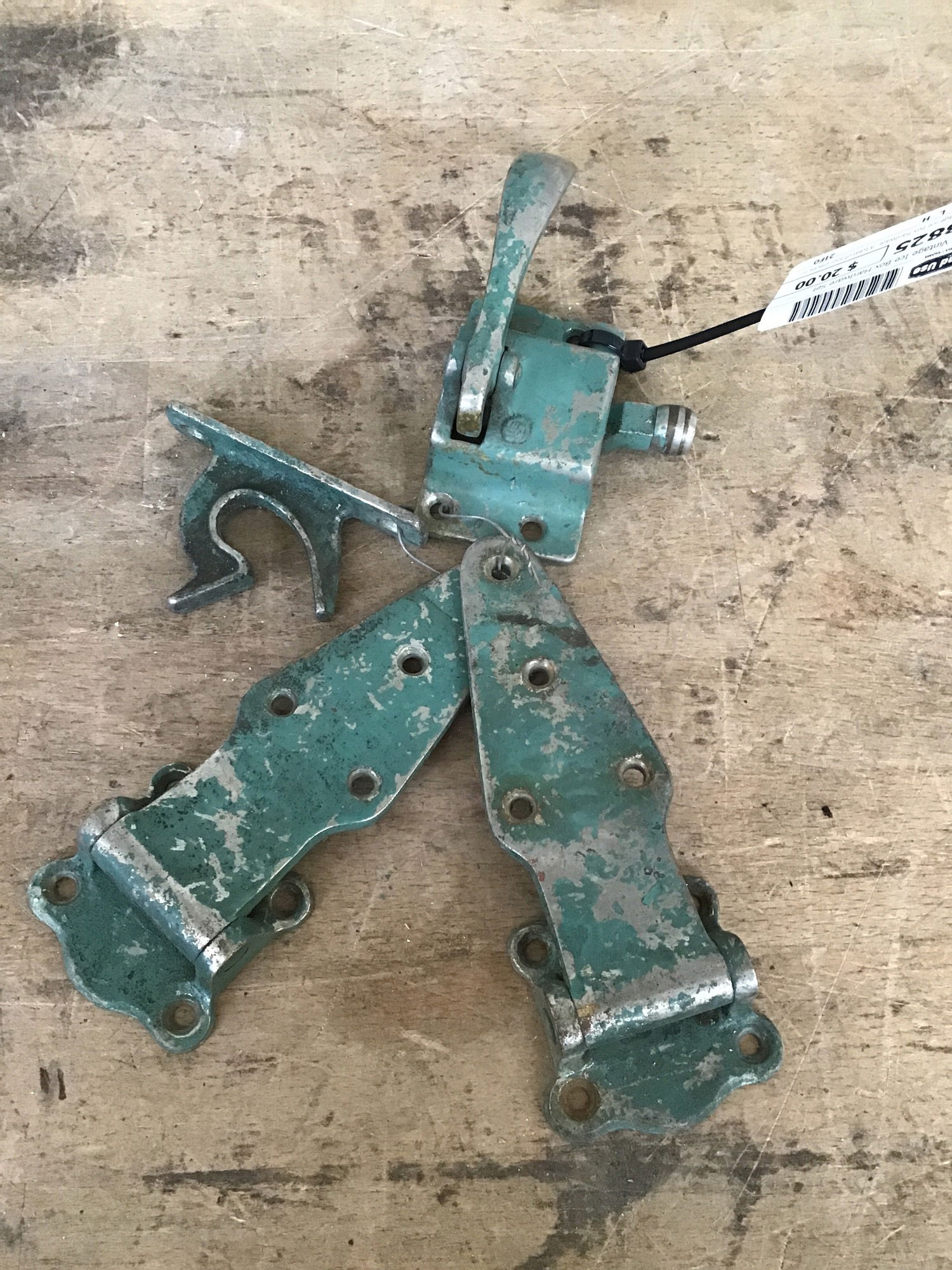 A set of vintage ice box hardware. A total of four pieces in the set, includes two hinges, latch and latch catch. They are painted green and the price reflects.