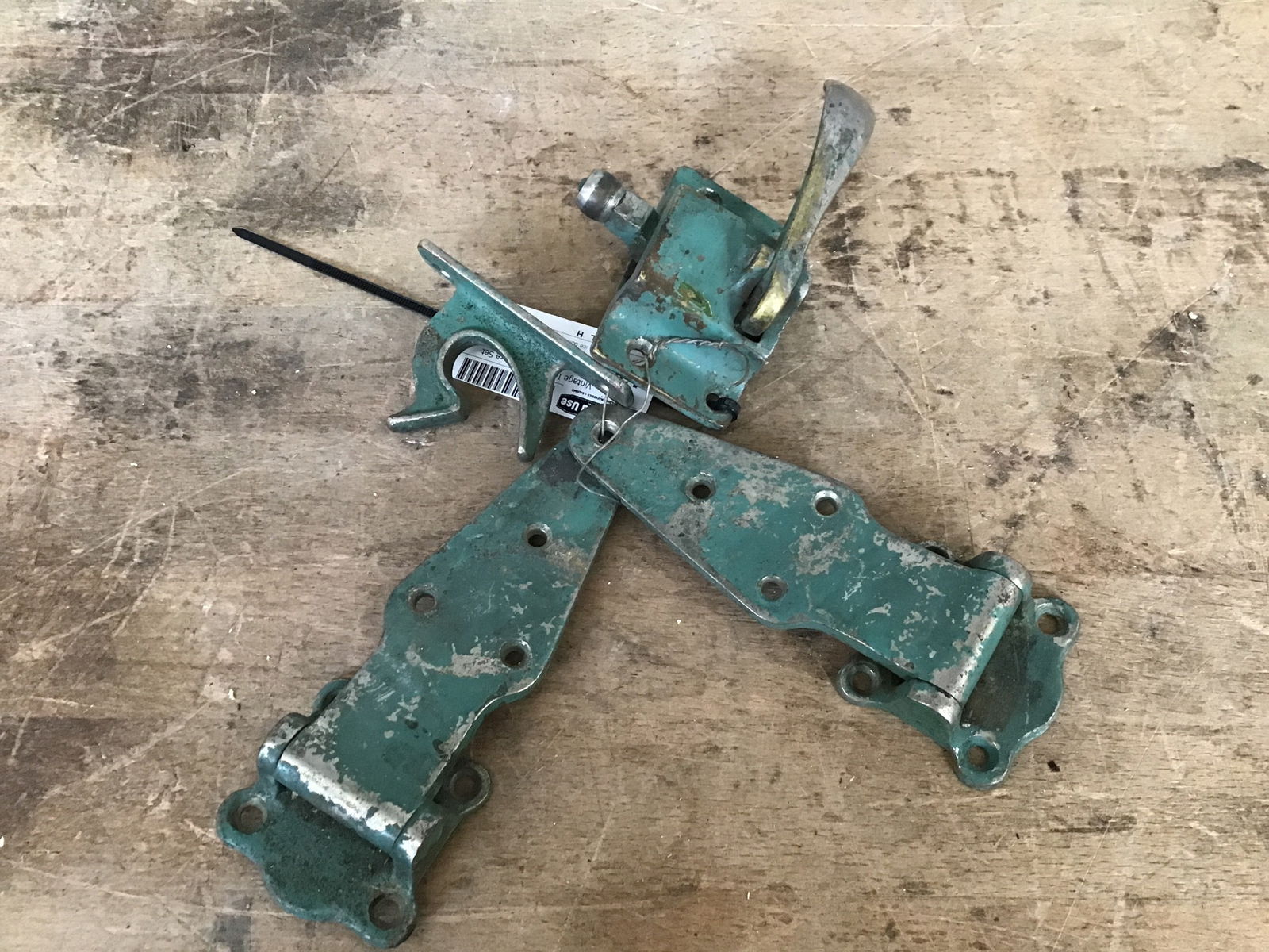 A set of vintage ice box hardware. A total of four pieces in the set, includes two hinges, latch and latch catch. They are painted green and the price reflects.