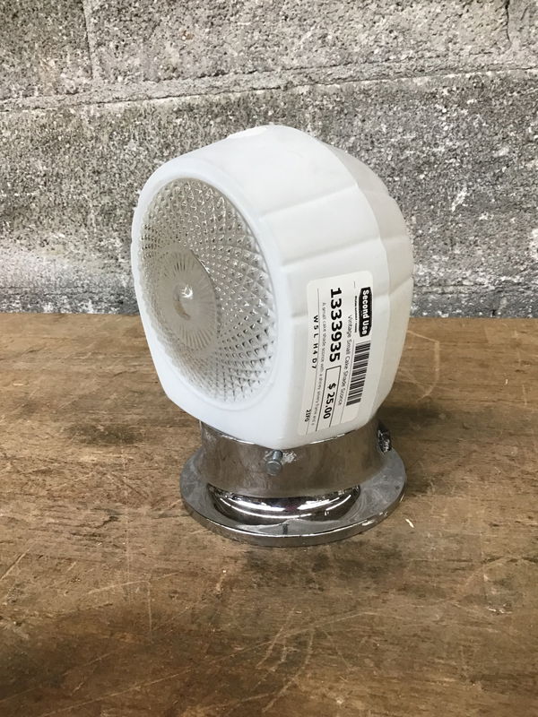 A small cake shade sconce with a shiney silvery frame and a opaque and transparent glass shade. Suitable for dry locations only. These would make good kitchen lights or bedroom lights.