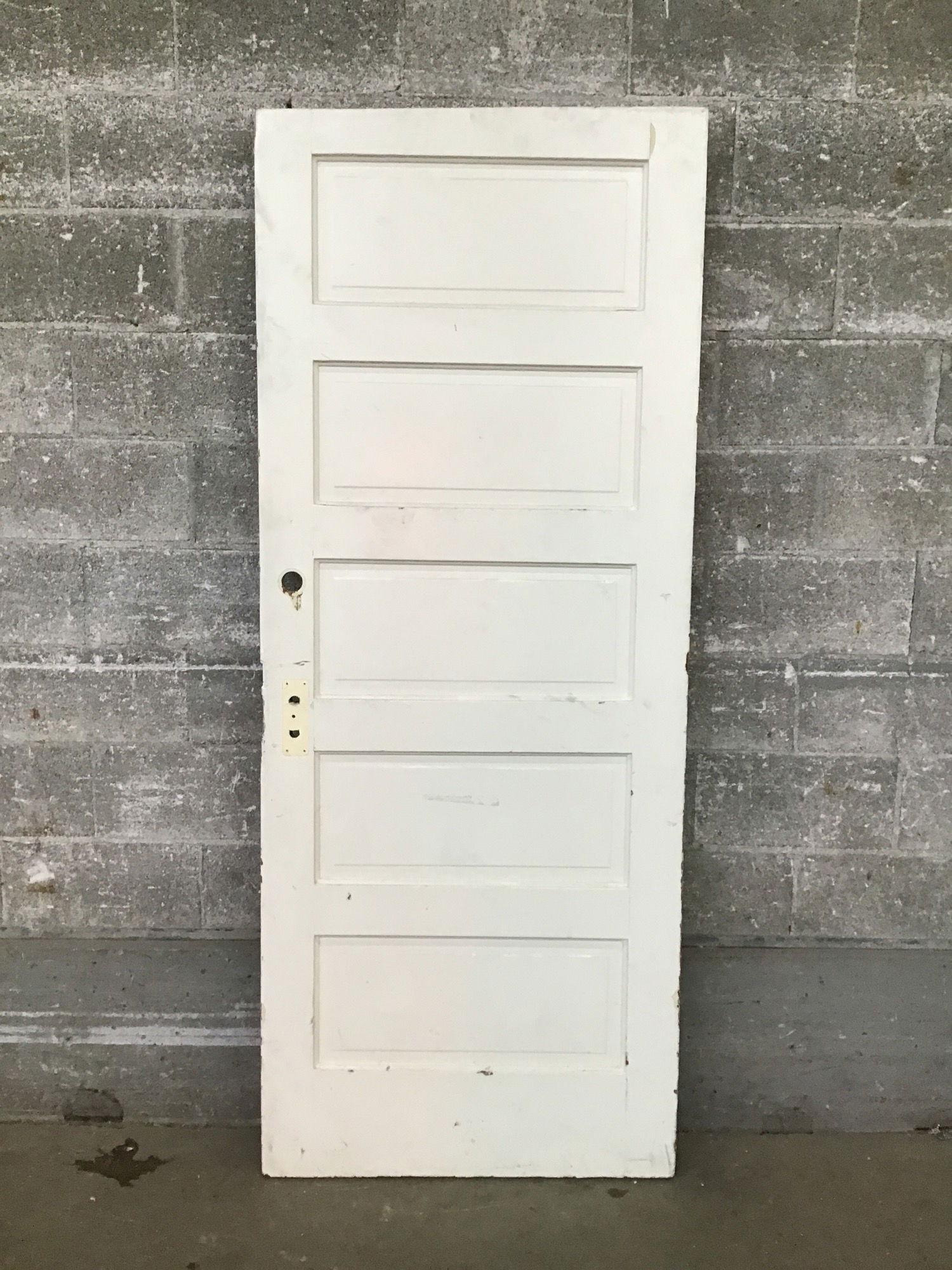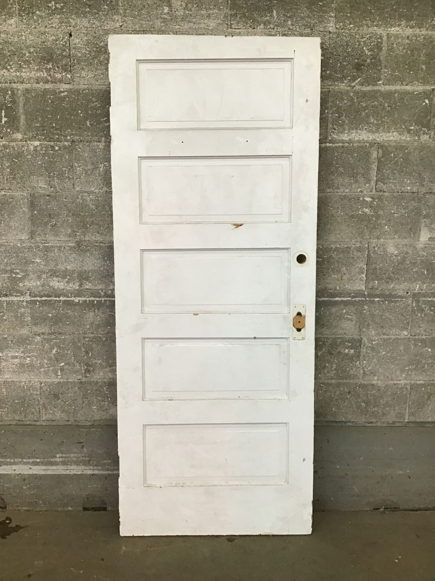 Bargain basement five panel fir door that has been cut down at the bottom. Missing original mortise, cosmetically challenged.