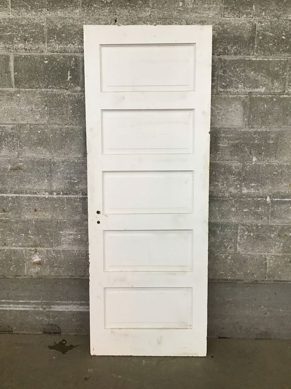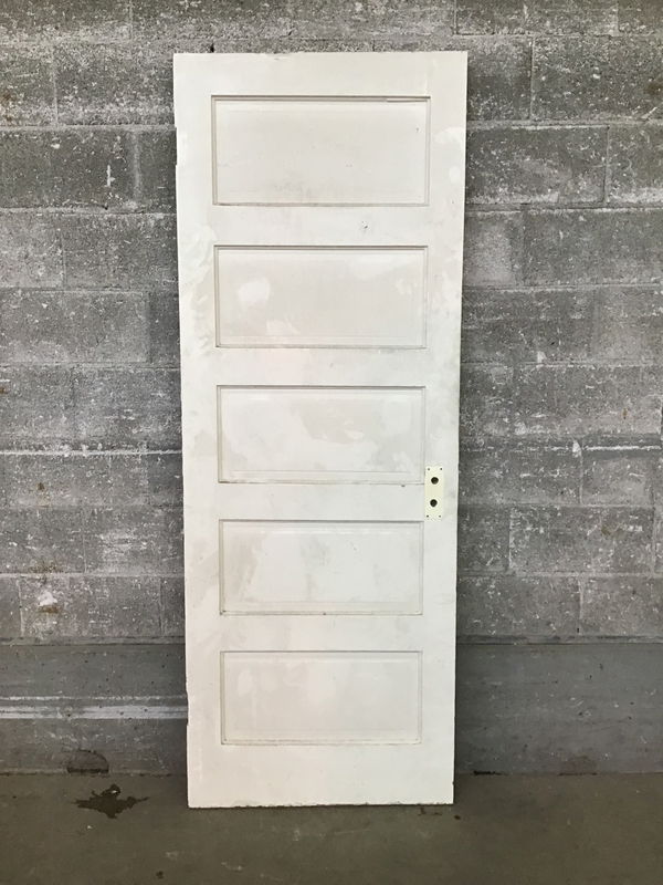 Bargain basement five panel fir door that is cosmetically challenged, missing original mortise and has been cut down.