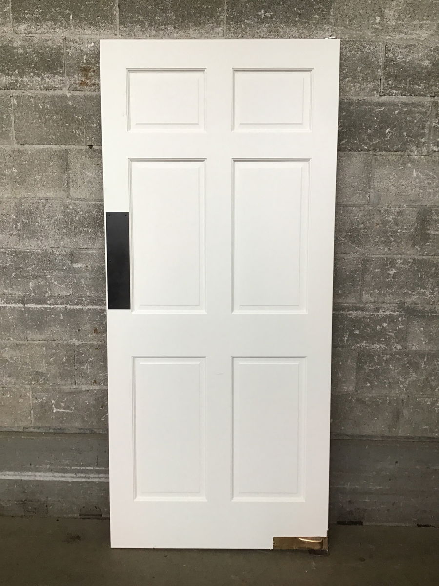 6-panel wood butler (or bommer) door with a nice coat of white paint on both sides. Has push plates on both sides with a sort of Japanned finish. Still has its spring on the bottom and the pin for the top.