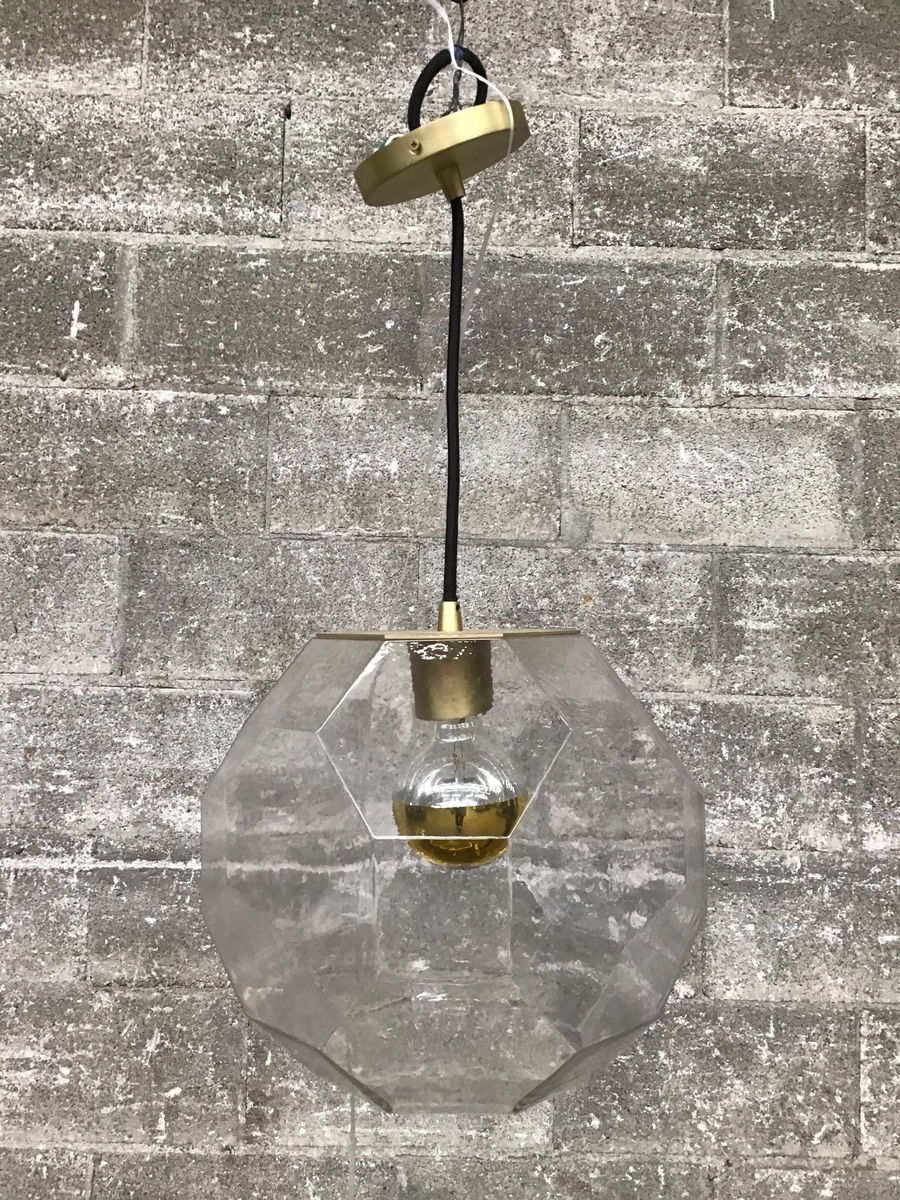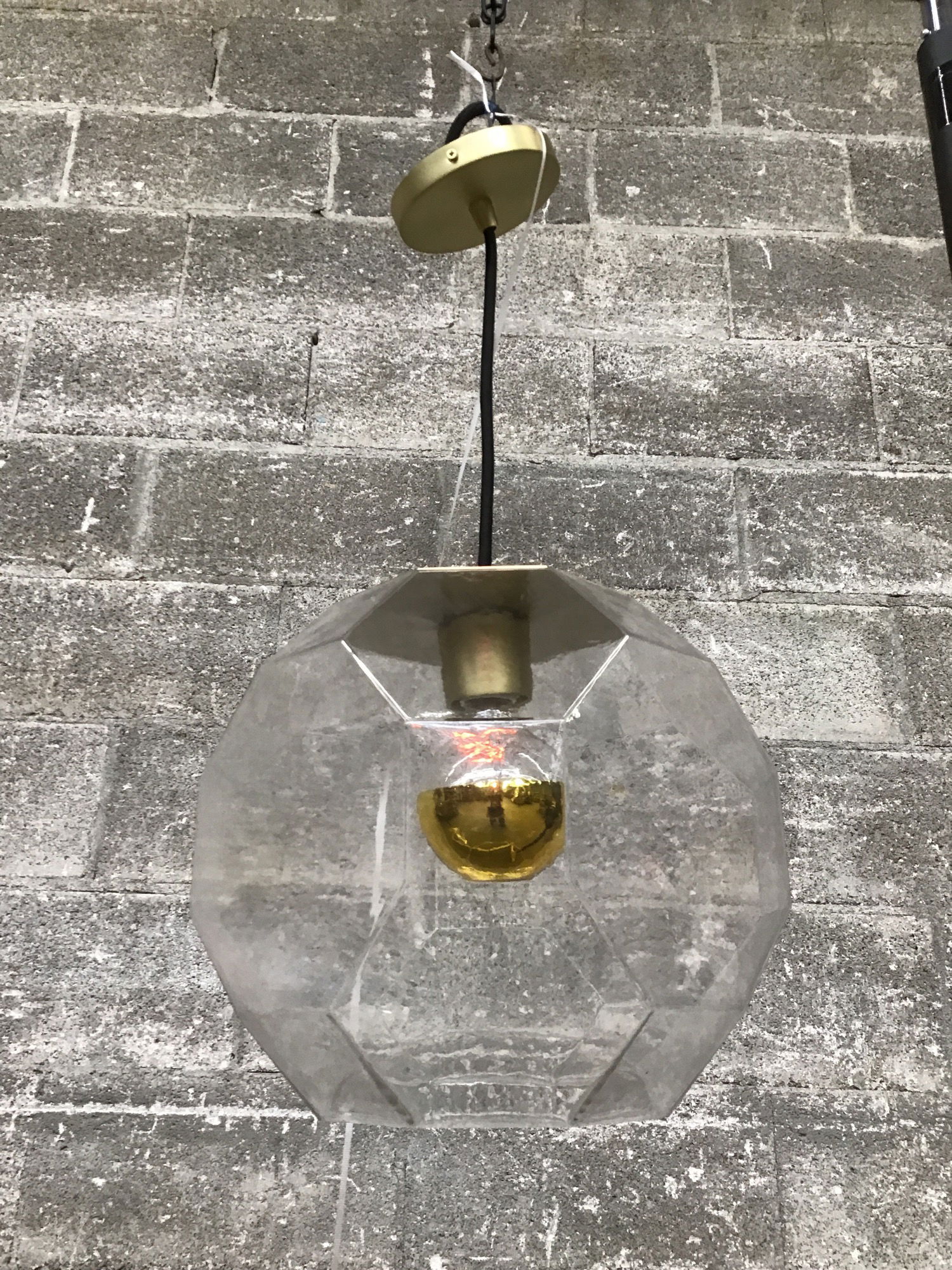Pendant light with a geometric clear glass globe shade and brushed brassy accent plate on its top. Has a fabric cord and matching brassy fitter up above. Looks similar to the style of lights made by Hudson Valley Lighting, but we weren't able to track down a specific listing online.